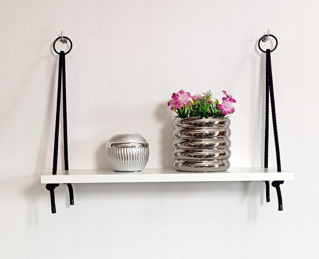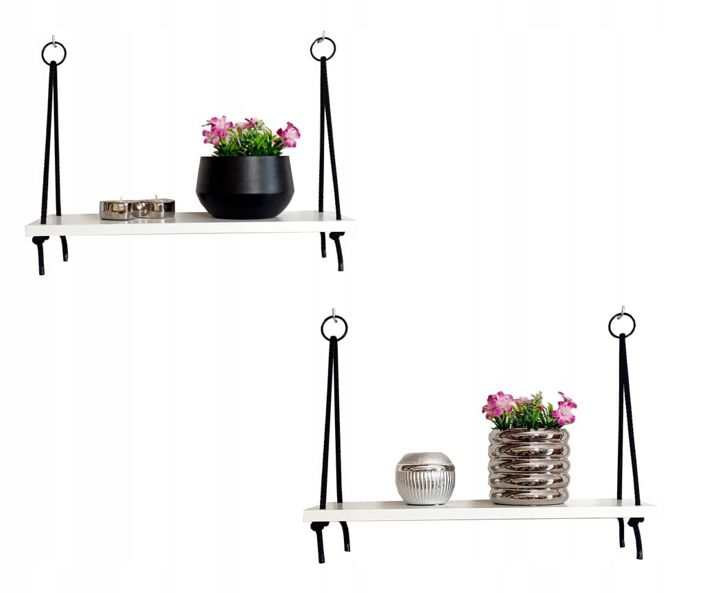 Zestaw zawiera: 2 Półki przełożone sznurem i wyregulowane (gotowe do zawieszenia) + 4 haczyki do montażu