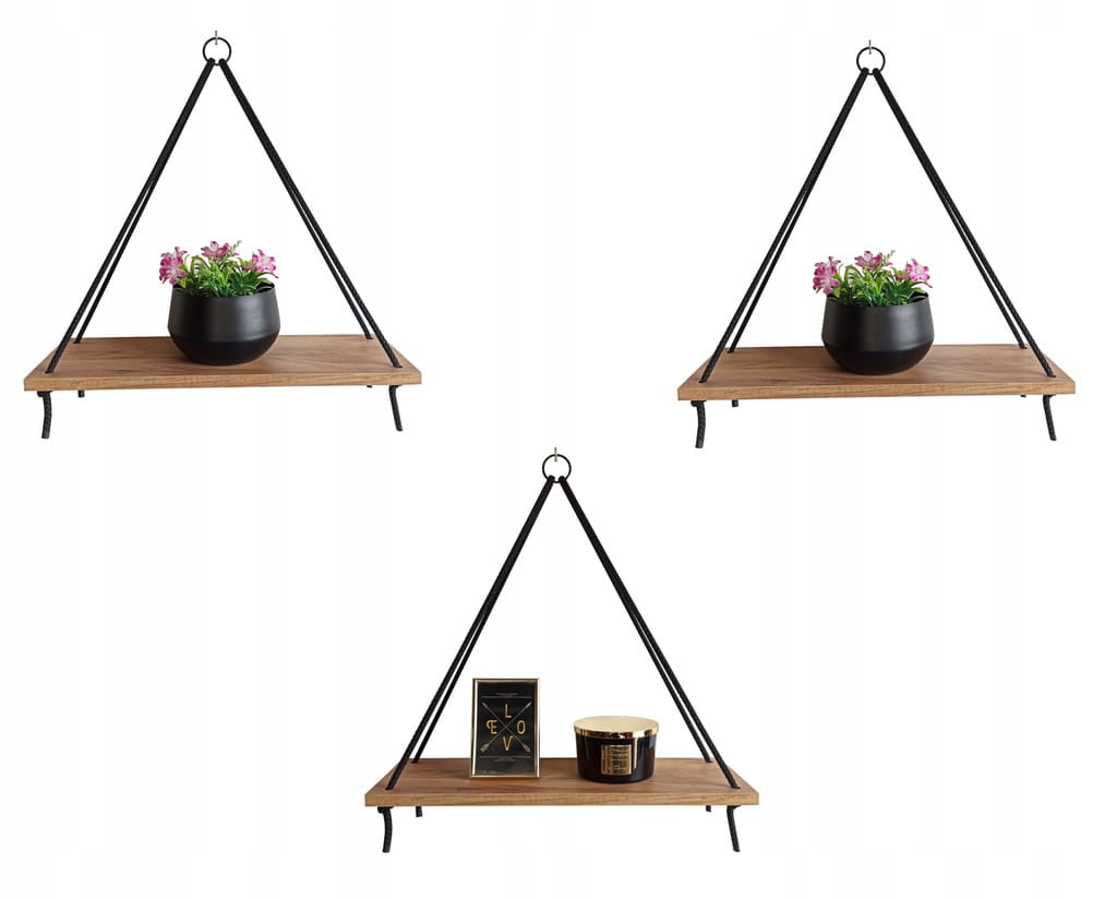 Zestaw zawiera: 3 Półki piramidki przełożone sznurem i wyregulowane (gotowe do zawieszenia) + 3 haczyki do montażu