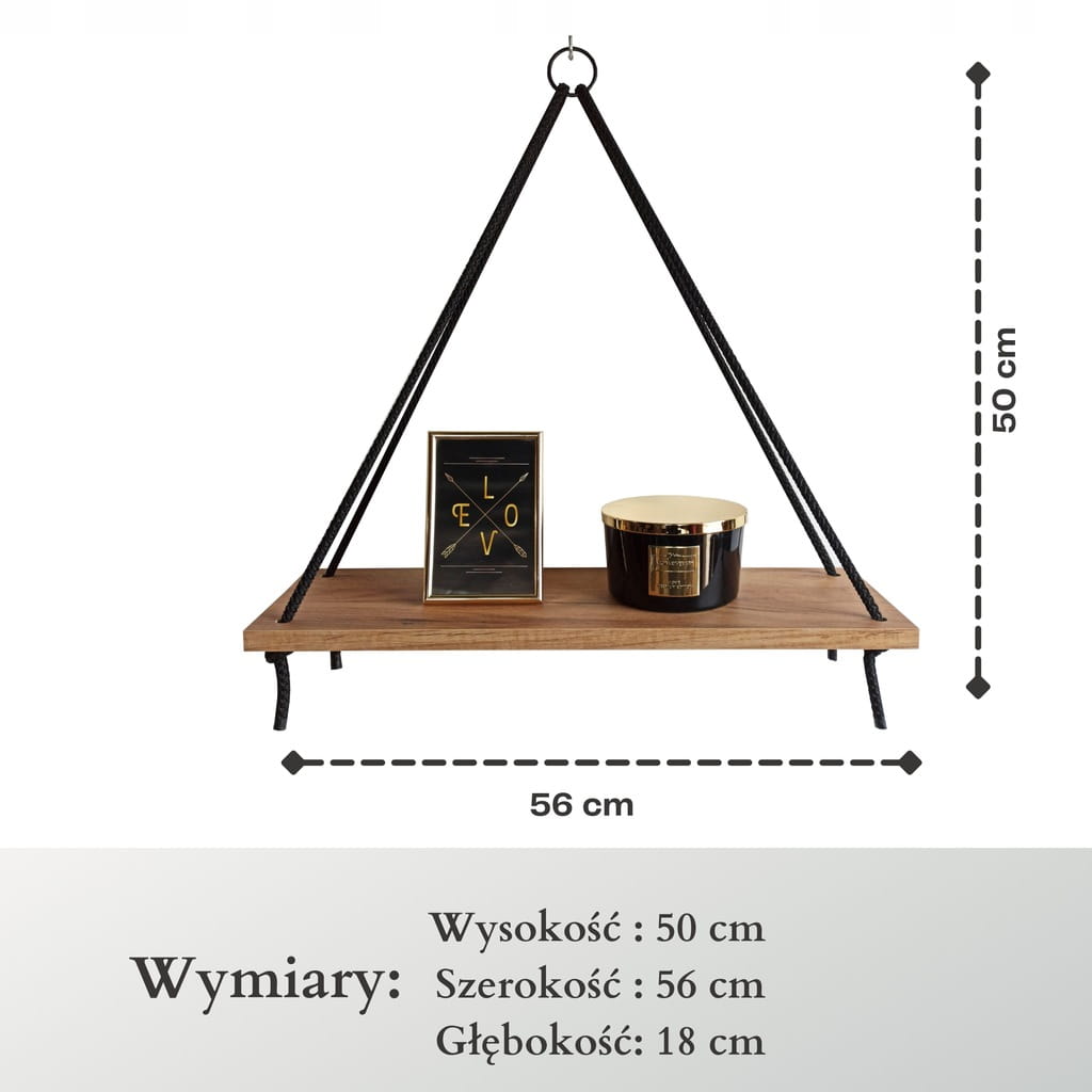 Półki wiszące 3 sztuki piramidki na Czarnych sznurach linach Styl Loft 56 cm