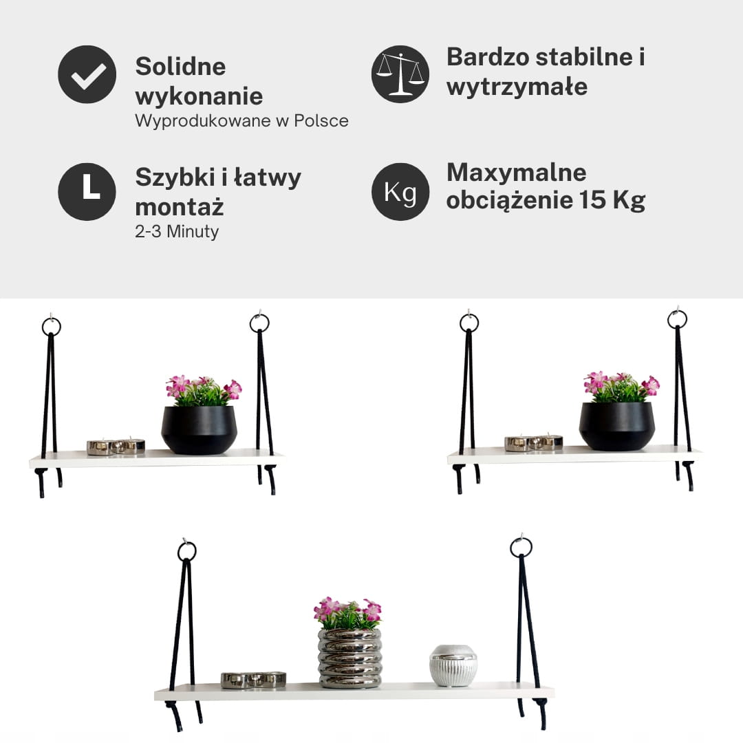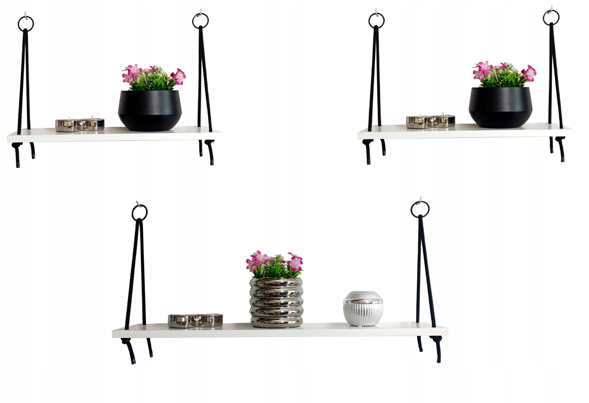 Zestaw zawiera: 3x Półkę (2x56 cm i 1x80 cm) przełożoną sznurem i wyregulowaną (gotową do zawieszenia) + 6 haczyków do montażu