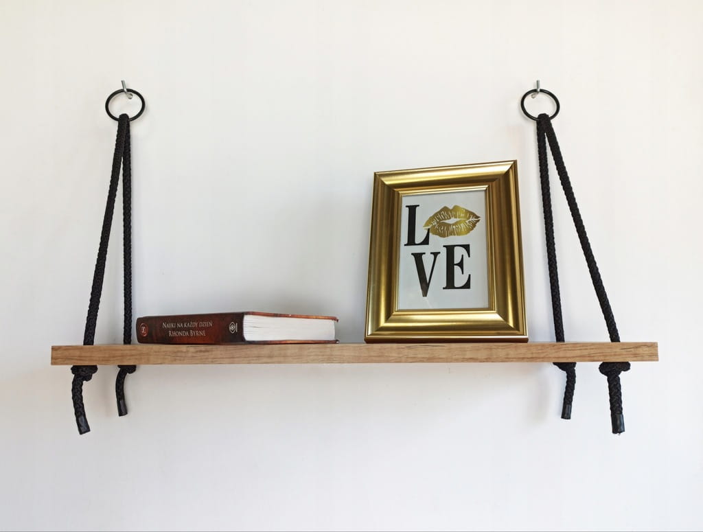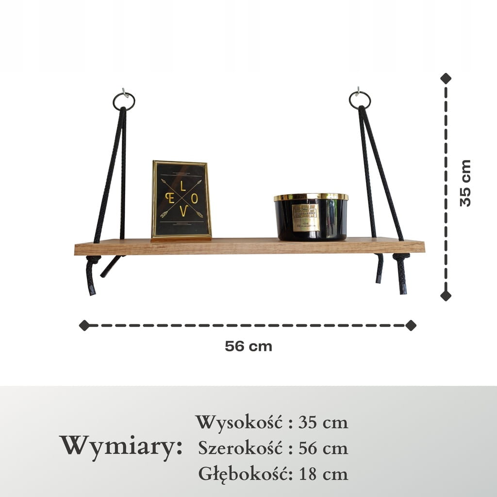 Zestaw zawiera: 3 Półki (2x 56cm, 1x 80cm) przełożone sznurem i wyregulowane (gotowe do zawieszenia) + 6 solidnych haczyków do montażu