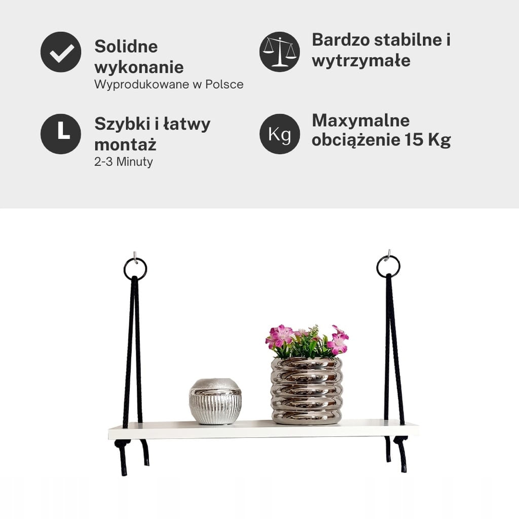 Zestaw zawiera: 3 Półki przełożone sznurem i wyregulowane (gotowe do zawieszenia) + 6 haczyków do montażu