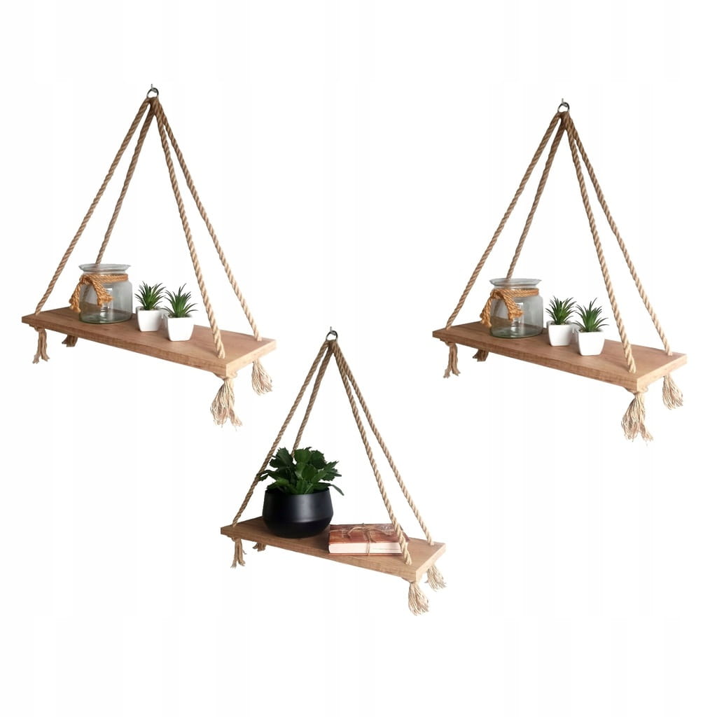 Zestaw zawiera: 3 półki piramidki przełożone sznurem i wyregulowane (gotowe do zawieszenia) + 3 haczyki do montażu