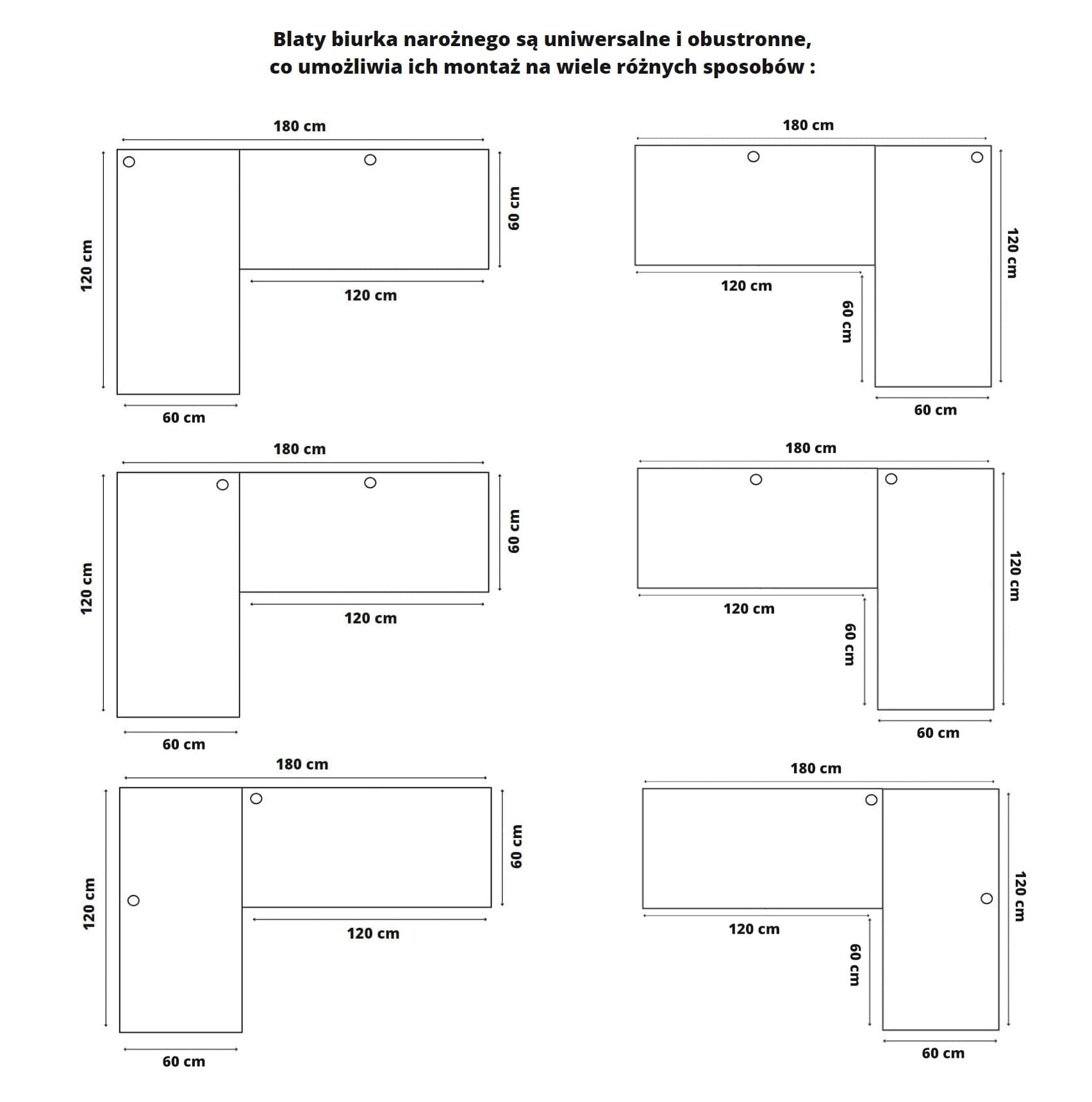 Standardowo w jednym blacie otwór jest pośrodku, a w drugim w kącie.