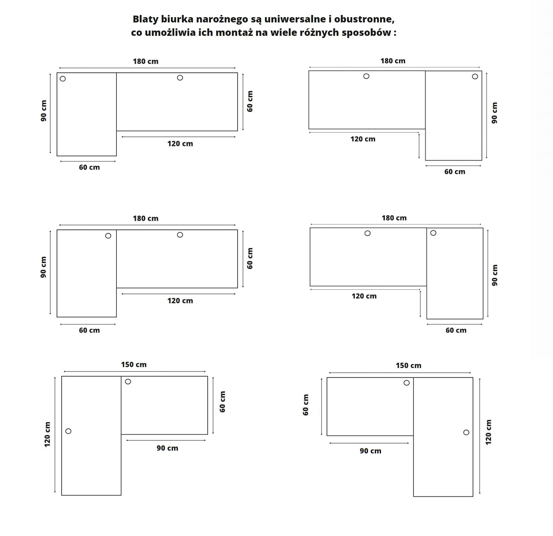 W zestawie znajdują się wszystkie niezbędne elementy do montażu biurka narożnego.