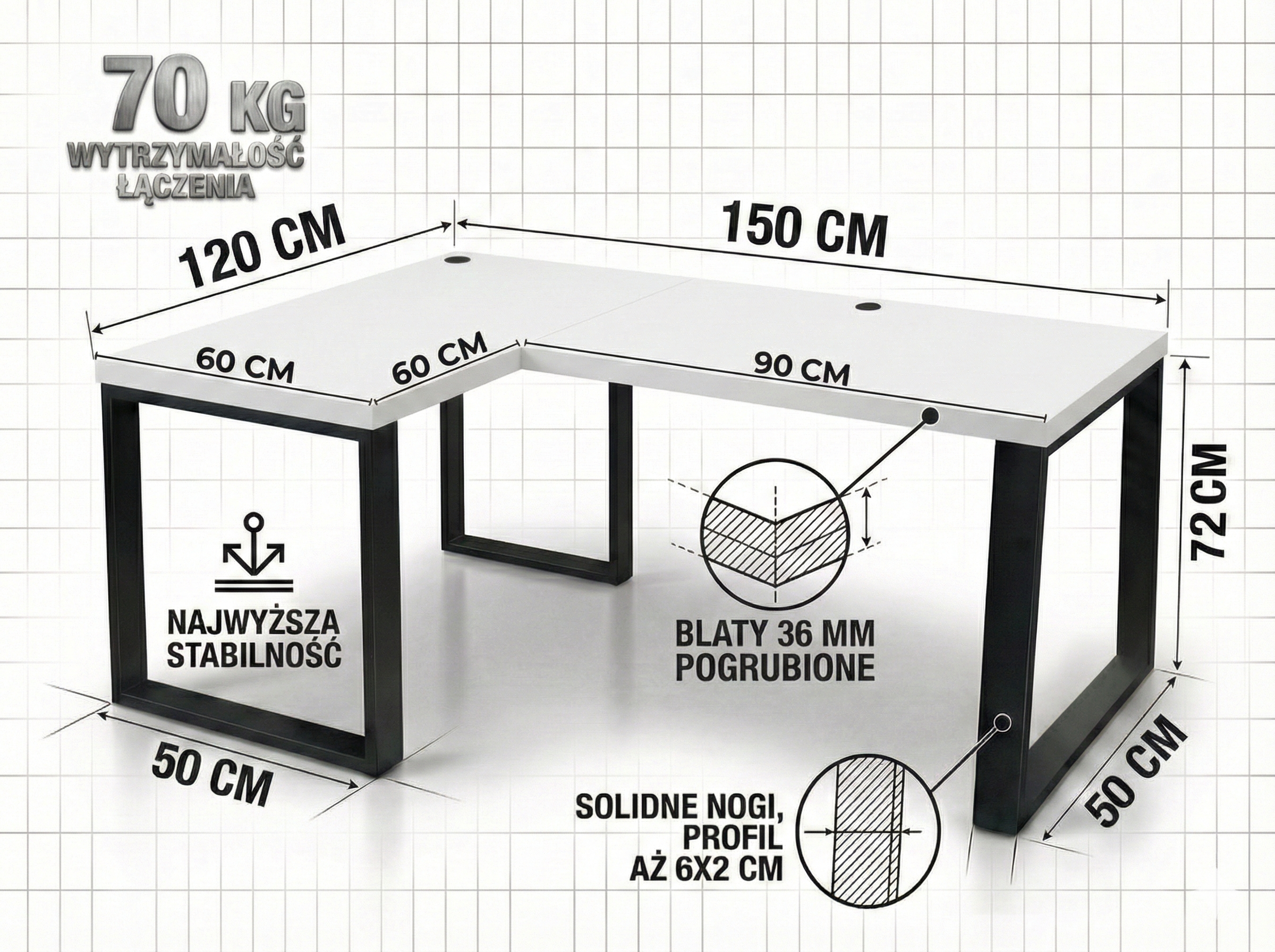 Biurko składa się z 2 blatów o wymiarach 120x60 cm oraz 90x60 cm o grubości 36 mm (podwójny blat) oraz 3 nóg loft. Grubość blatu zapewnia solidność i wygodę użytkowania. Metalowe nogi o profilu 6x2 cm w kolorze czarnym nadają mu industrialnego charakteru będąc jednocześnie stabilnym fundamentem.