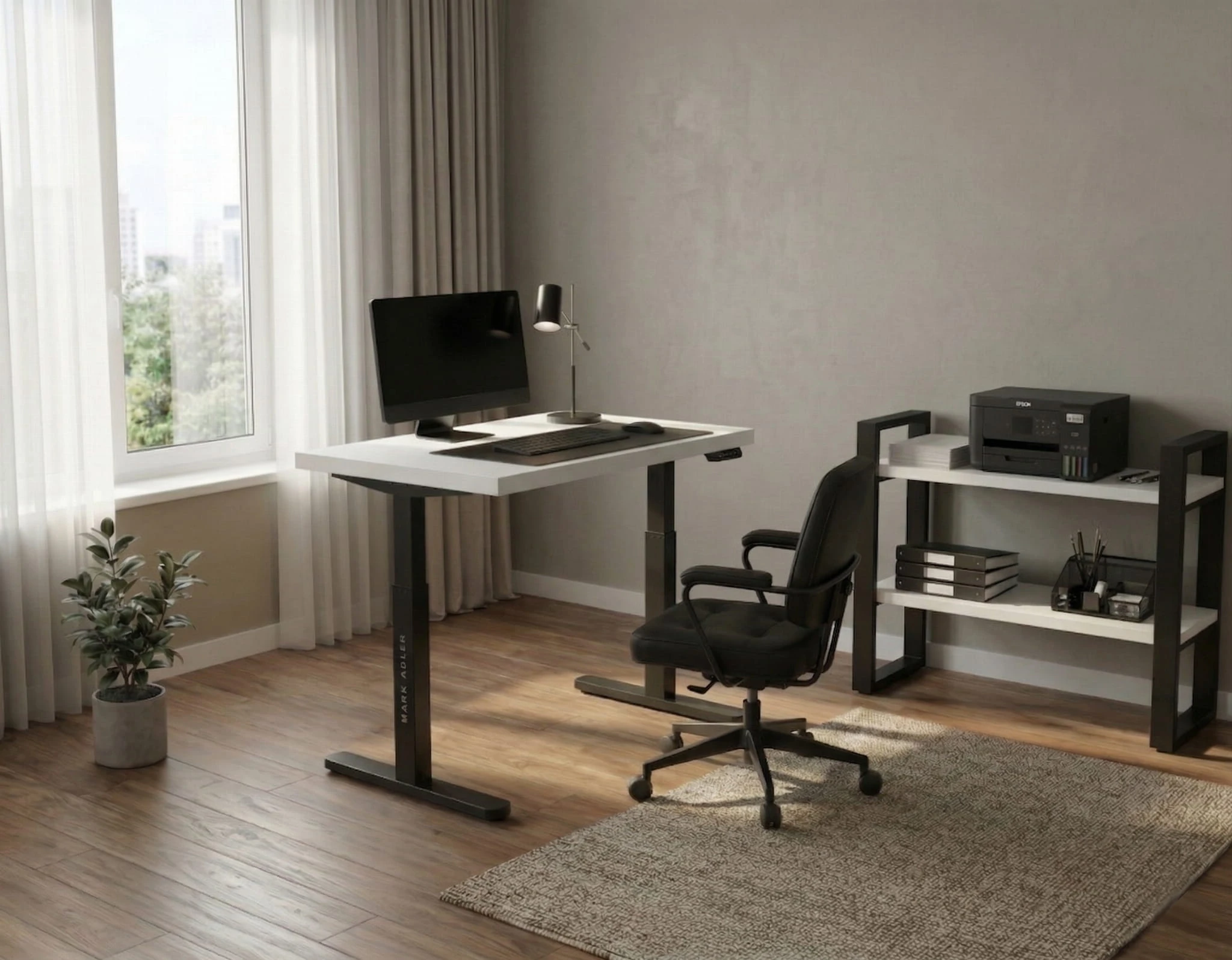 Dzięki regulowanej szerokości stelaża stworzysz przestrzeń, jaką lubisz — rozstaw nóg biurka dopasujesz do swoich potrzeb i warunków mieszkaniowych.