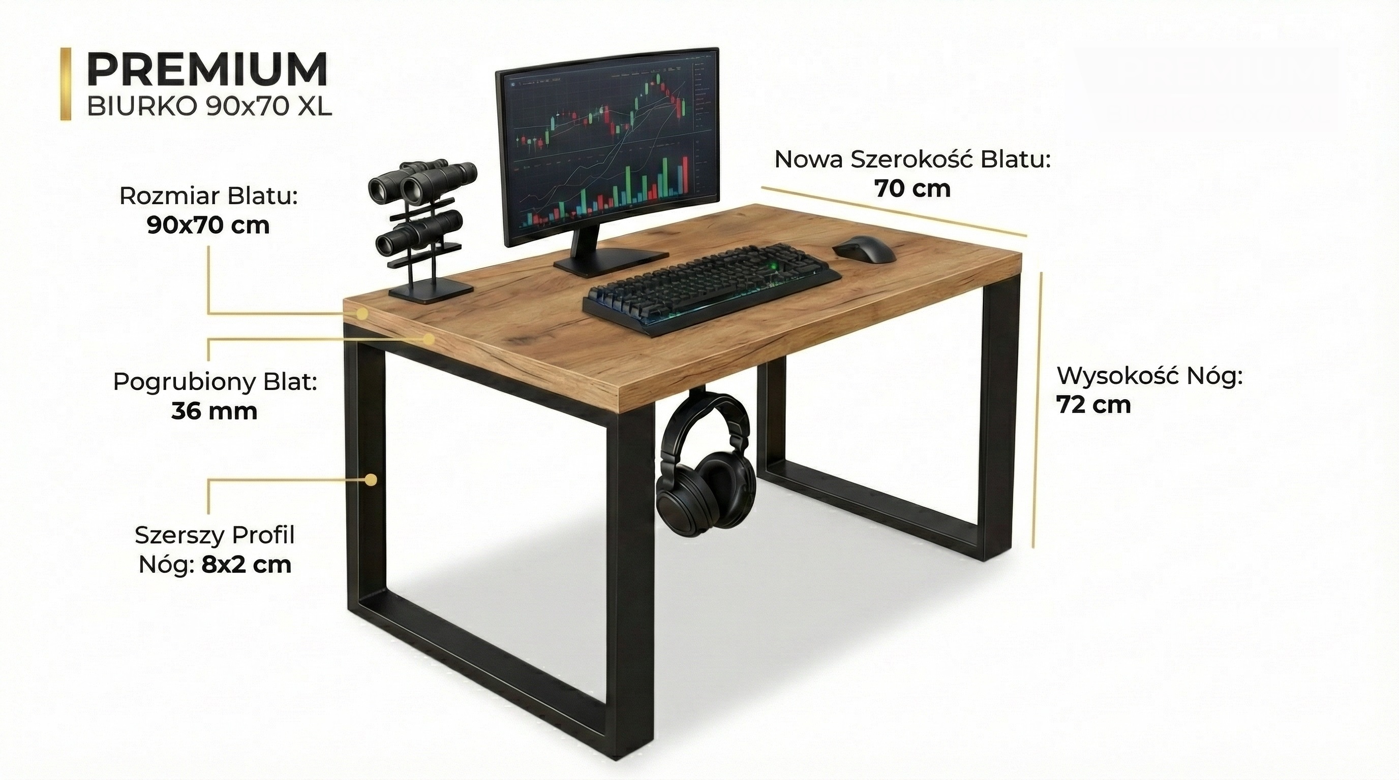 BIURKO GAMINGOWE SERIA XL 90X70 cm Blat pogrubiony 36 mm KOMPUTEROWE DO FIRMY BIURA DĄB CRAFT ZŁOTY W STYLU LOFT