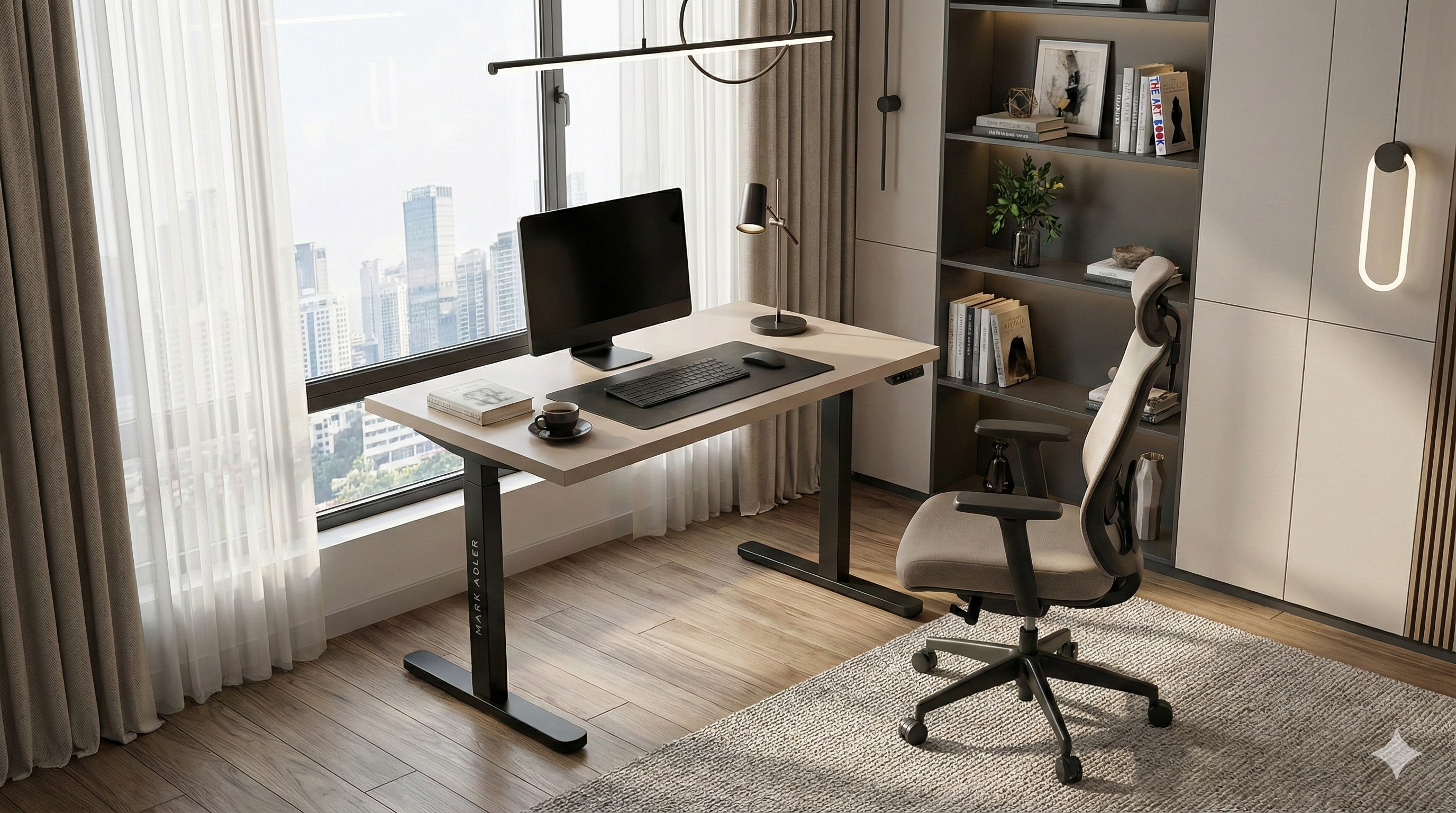Dzięki regulowanej szerokości stelaża stworzysz przestrzeń, jaką lubisz — rozstaw nóg biurka dopasujesz do swoich potrzeb i warunków mieszkaniowych.