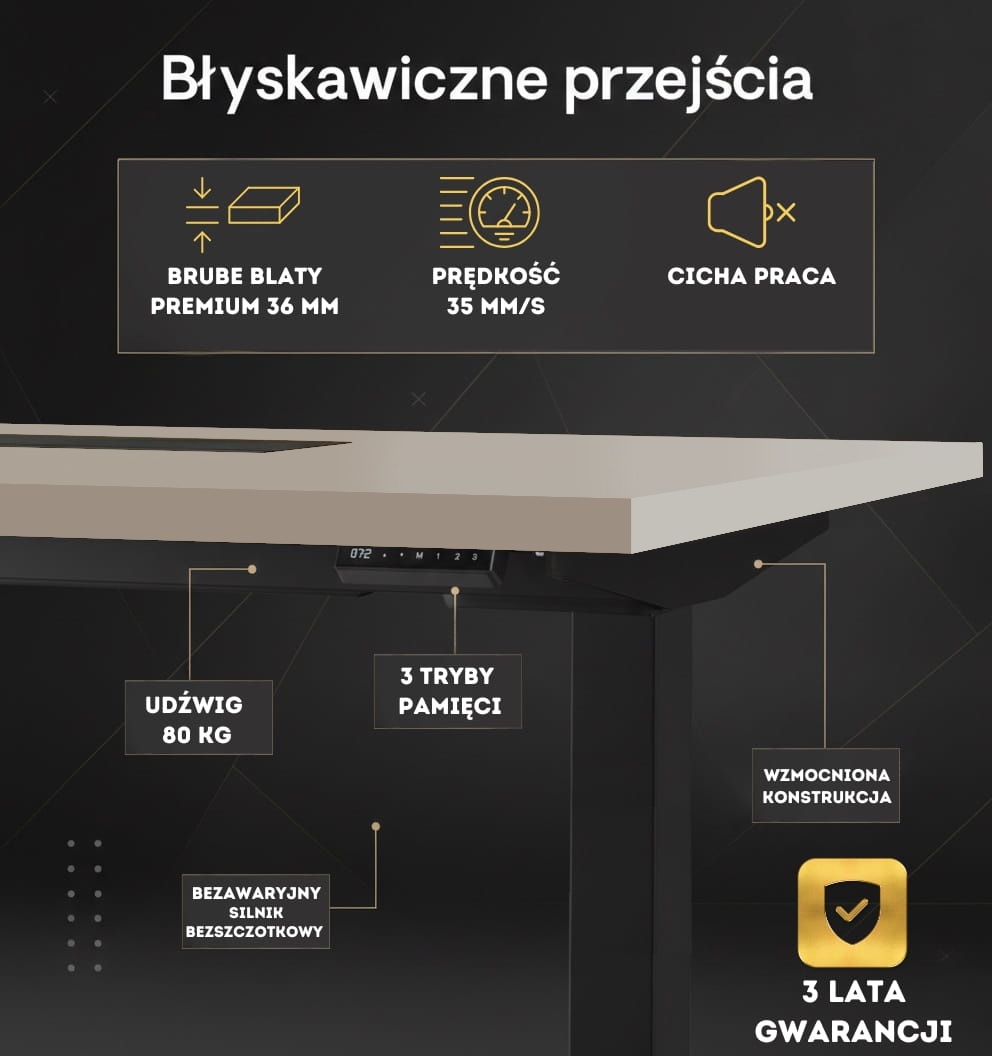 ➡️Solidny, gruby blat nie tylko zwiększa wytrzymałość biurka, ale także dodaje mu wyjątkowego, nowoczesnego wyglądu. Dzięki swojej konstrukcji, blat umożliwia montaż dodatkowych akcesoriów, takich jak uchwyty na monitory, wieszaki na słuchawki, czy podstawki na kubki, bez obaw o jego trwałość. To idealne rozwiązanie dla osób, które chcą dostosować przestrzeń roboczą do swoich indywidualnych potrzeb.