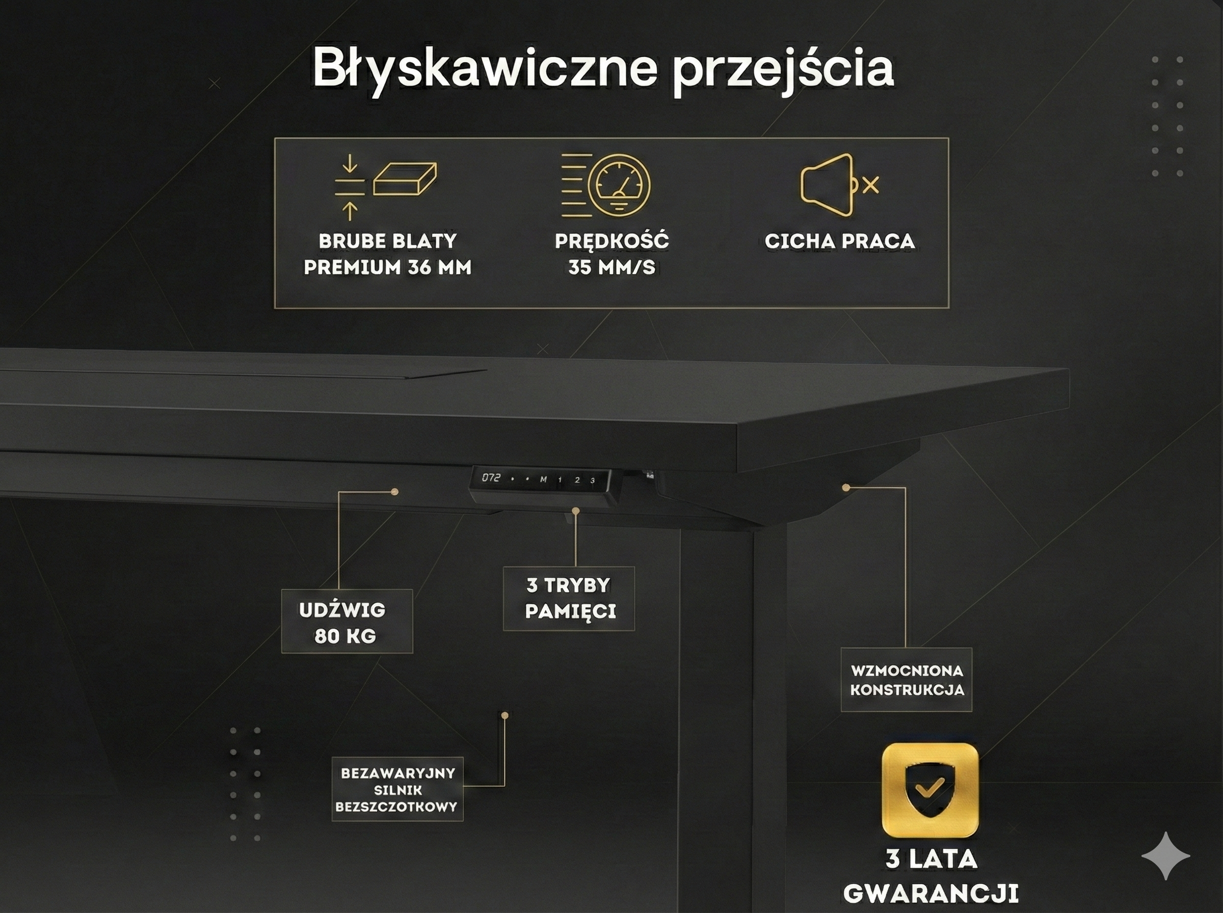 ➡️Solidny, gruby blat nie tylko zwiększa wytrzymałość biurka, ale także dodaje mu wyjątkowego, nowoczesnego wyglądu. Dzięki swojej konstrukcji, blat umożliwia montaż dodatkowych akcesoriów, takich jak uchwyty na monitory, wieszaki na słuchawki, czy podstawki na kubki, bez obaw o jego trwałość. To idealne rozwiązanie dla osób, które chcą dostosować przestrzeń roboczą do swoich indywidualnych potrzeb.