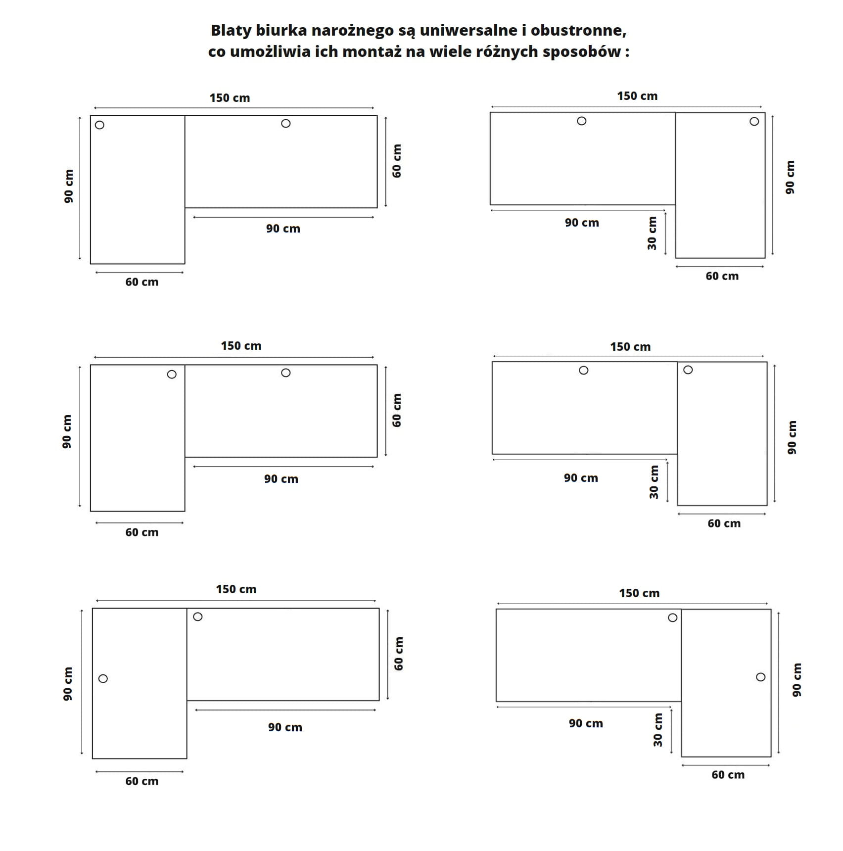 Standardowo w jednym blacie otwór jest pośrodku, a w drugim w kącie.
