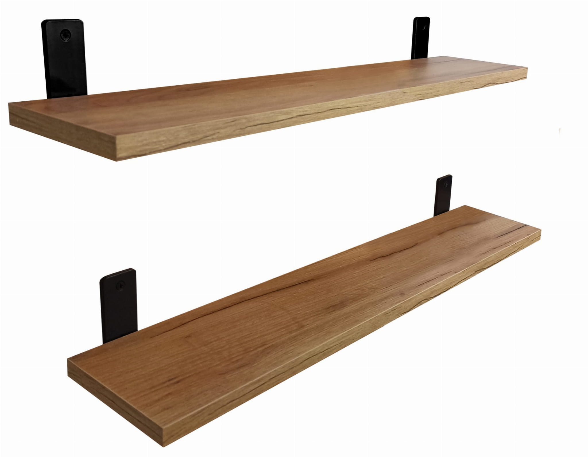 Dwie eleganckie półki wiszące w kolorze dąb craft złoty z metalowymi, masywnymi uchwytami w kształcie kontownika to nie tylko ozdoba, ale również solidność i funkcjonalność w jednym. Zaskakująco duży udźwig wynoszący aż 20 kg sprawia, że są nie tylko estetyczne, ale także bardzo praktyczne.