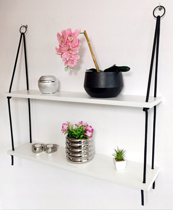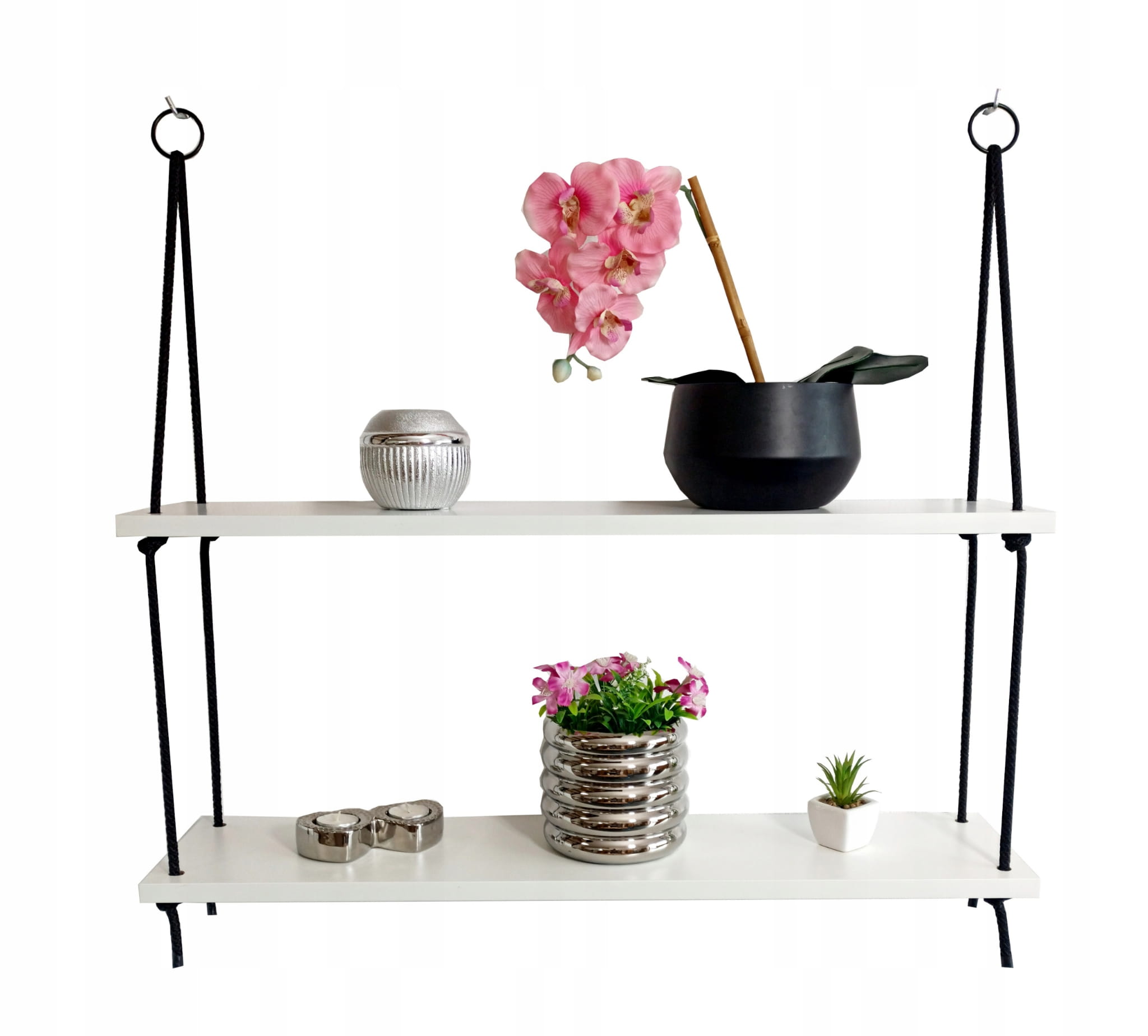 Zestaw zawiera: półkę 2 poziomową (80cm szerokości) przełożoną sznurem i wyregulowaną (gotową do zawieszenia) + 2 haczyki do montażu
