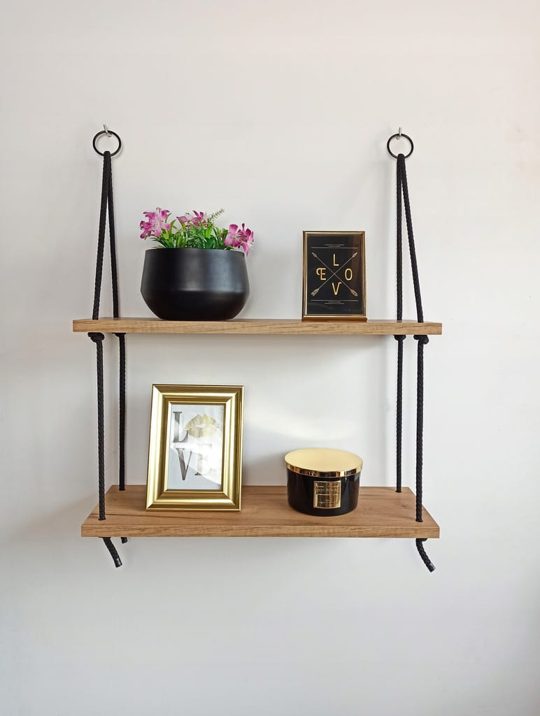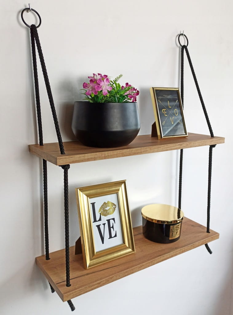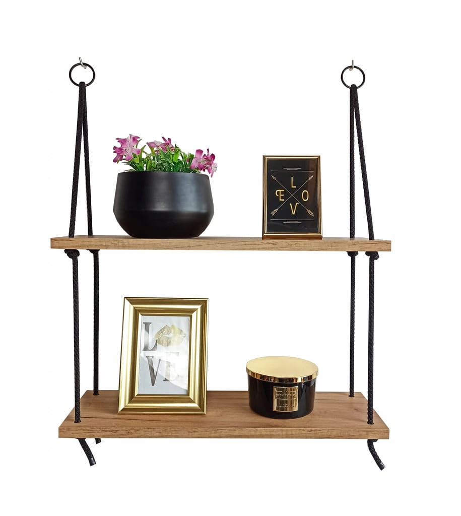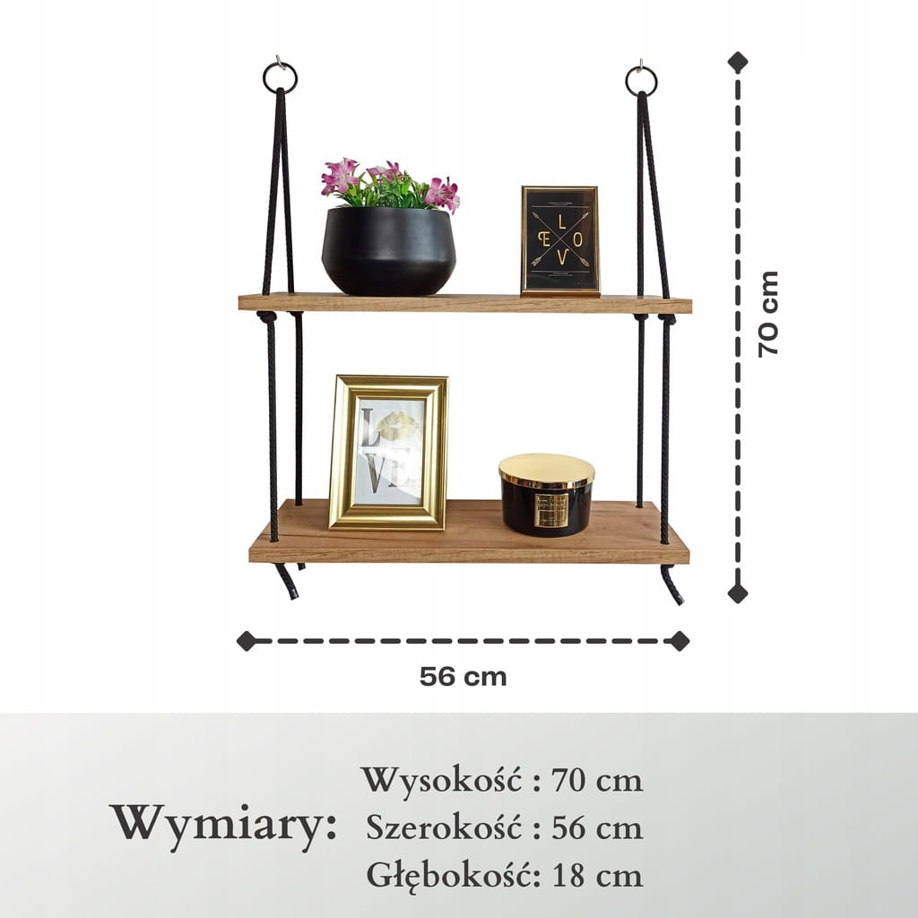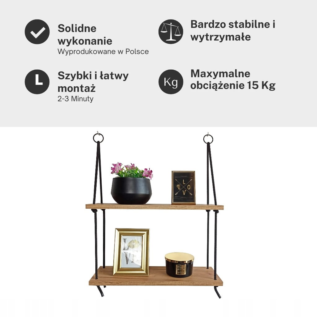 Zestaw zawiera: półkę 2 poziomową przełożoną sznurem i wyregulowaną (gotową do zawieszenia) + 2 haczyki do montażu