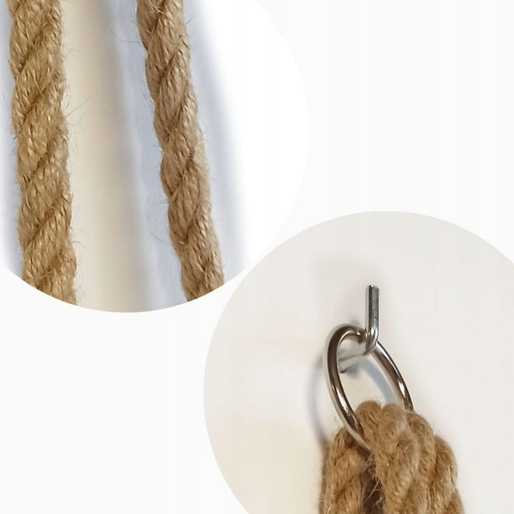 Elementem, który wywiera największe wrażenie wizualne jest lina jutowa, która łączy półki podtrzymując je solidnymi supłami. Juta to materiał w pełni biodegradowalny, składa się w 100% z naturalnego włókna, dzięki temu ma duże możliwości recyklingowe.