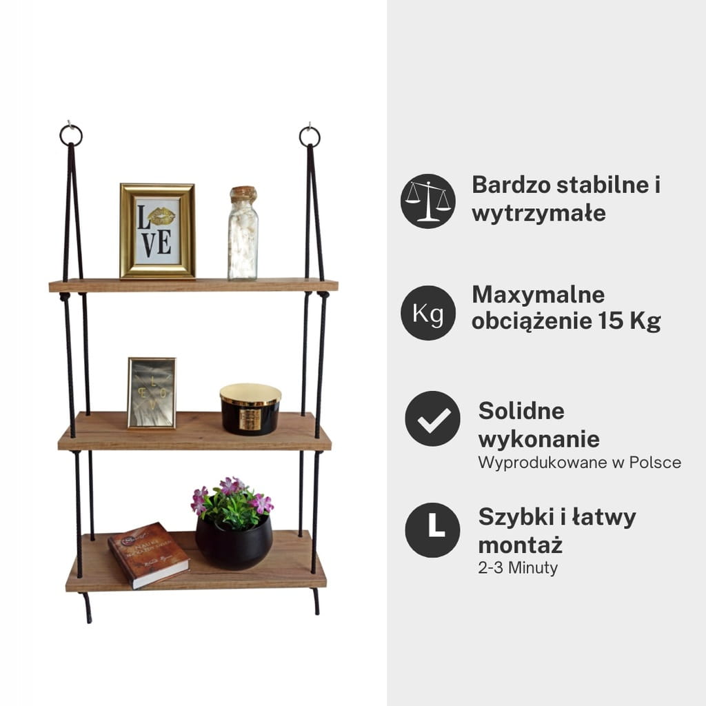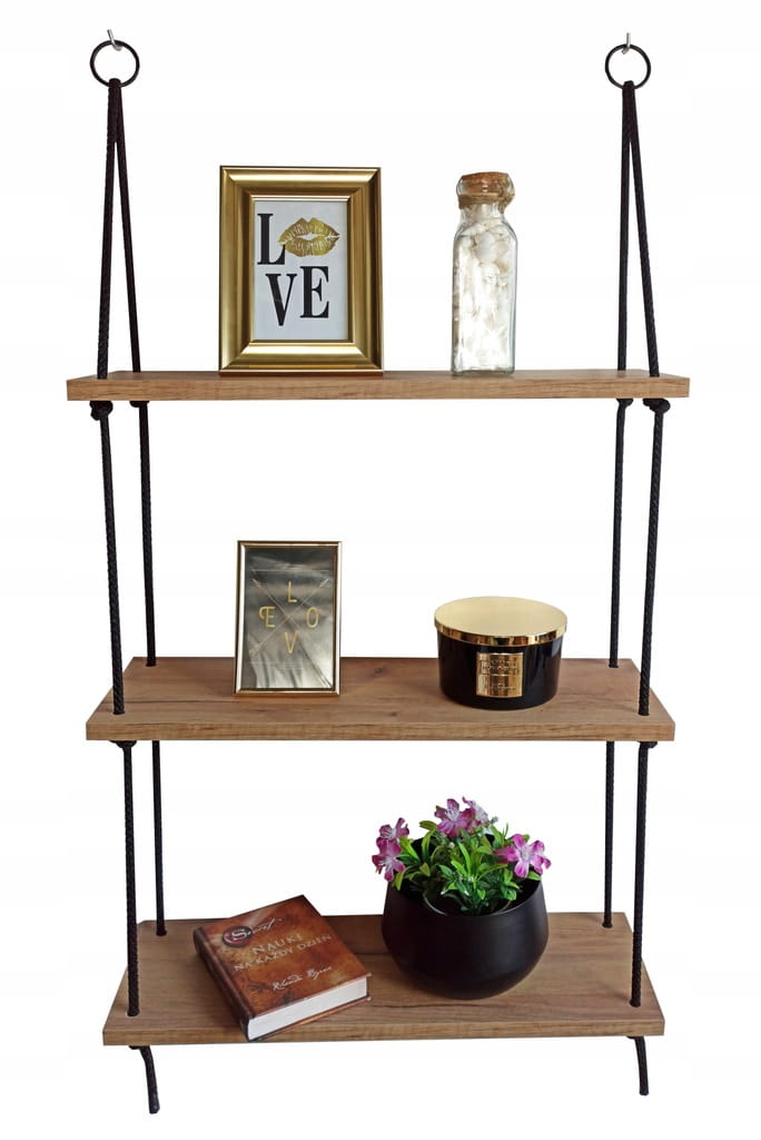 Półka wisząca 3 poziomy na Czarnych sznurach linach Styl Loft 56 cm