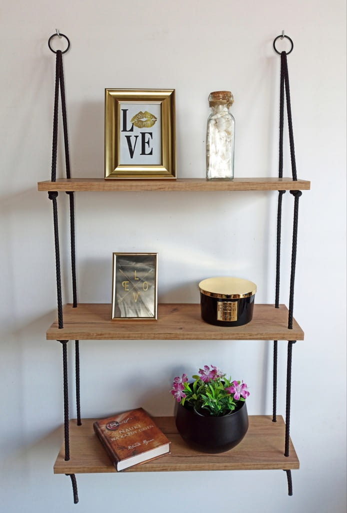 Zestaw zawiera: Półkę 3 poziomową przełożoną sznurem i wyregulowaną (gotową do zawieszenia) + 2 haczyki do montażu