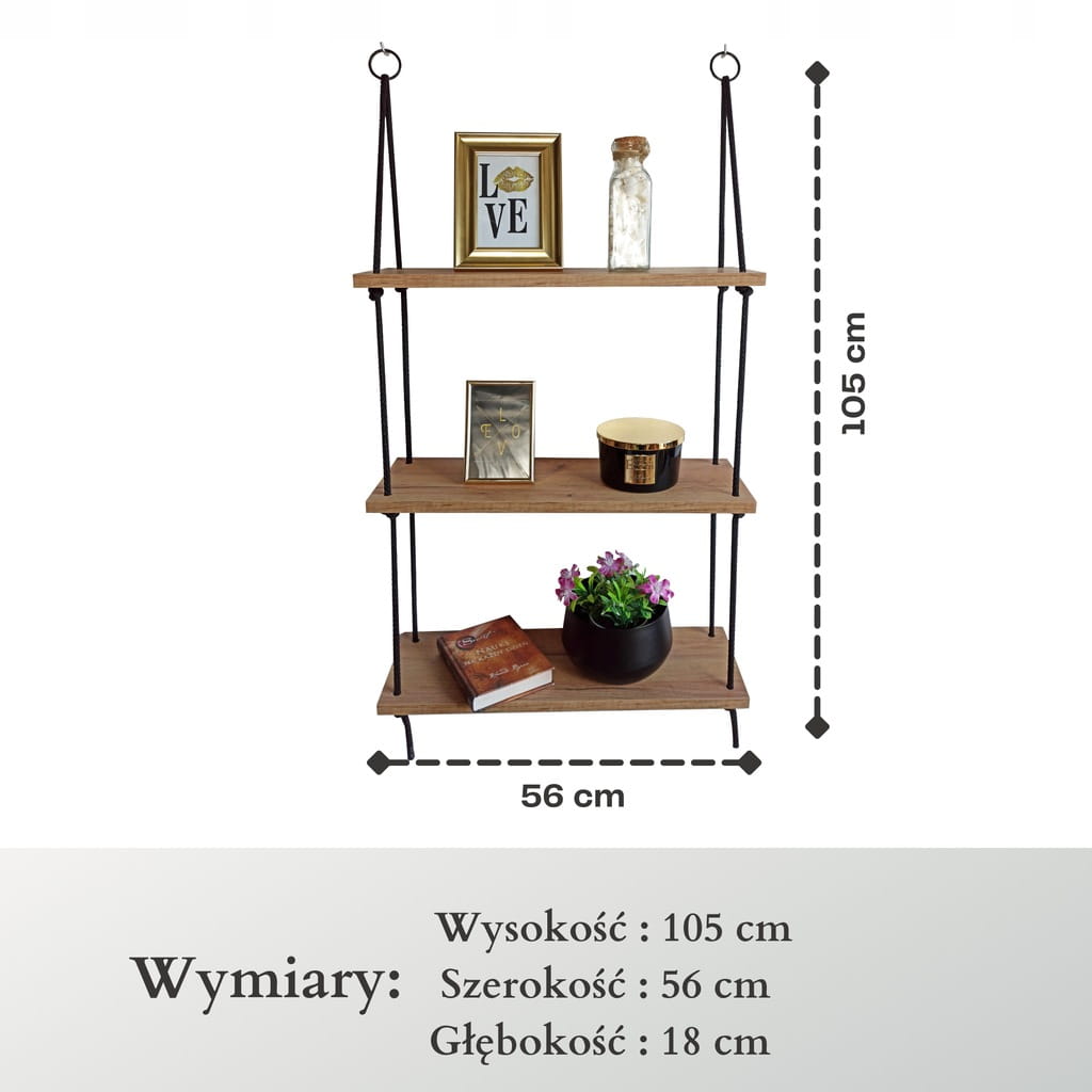 Półka wisząca na linie 3 poziomy LOFT RUSTYKALNA INDUSTRIALNA 56 cm