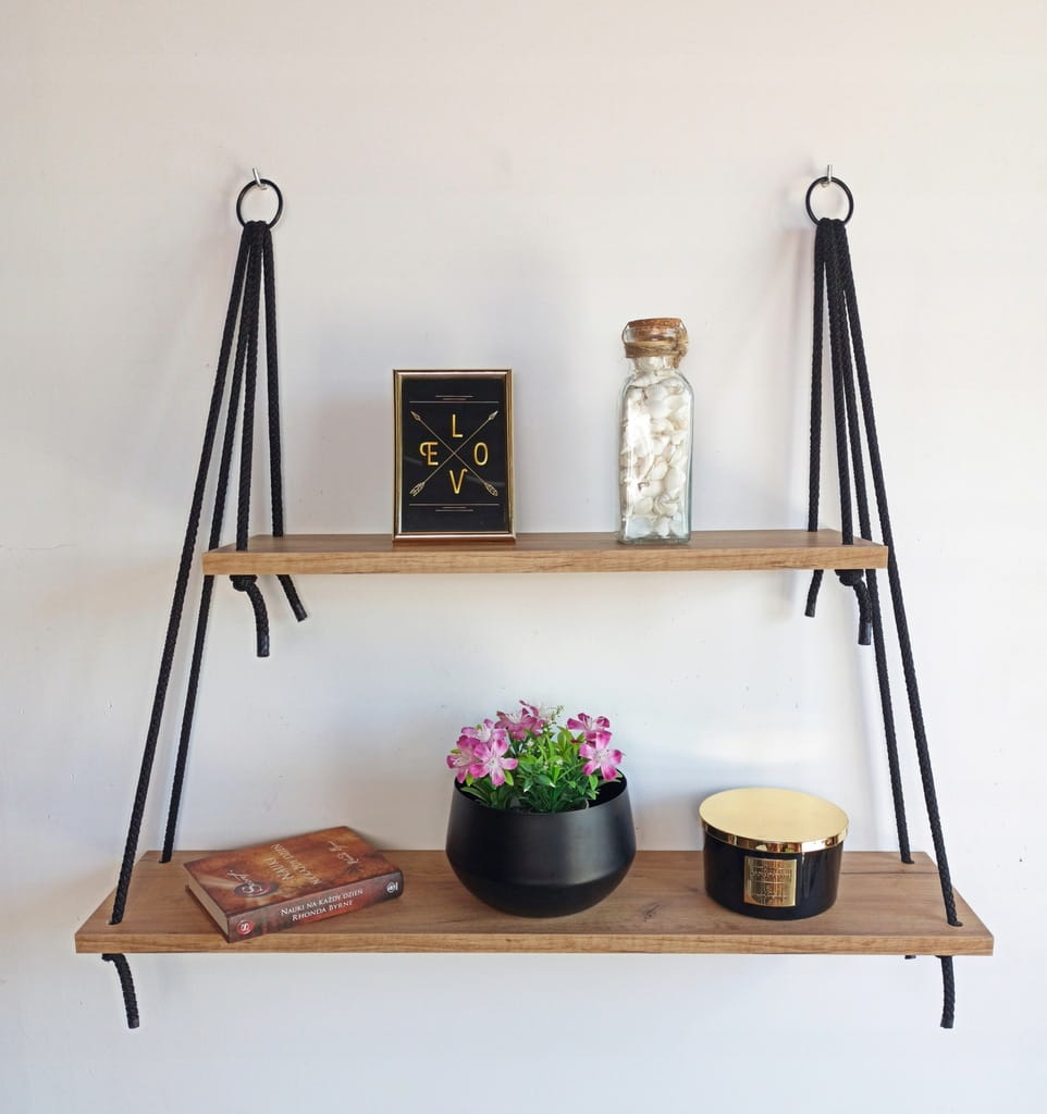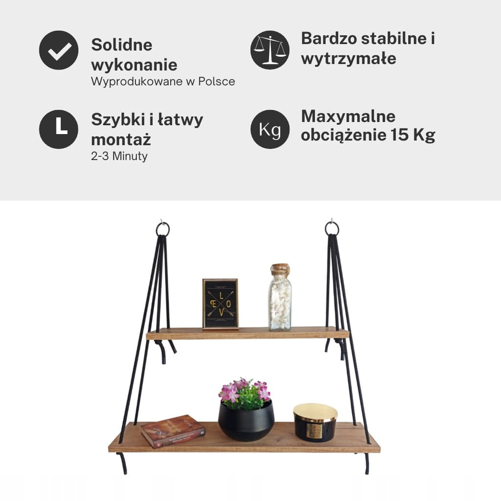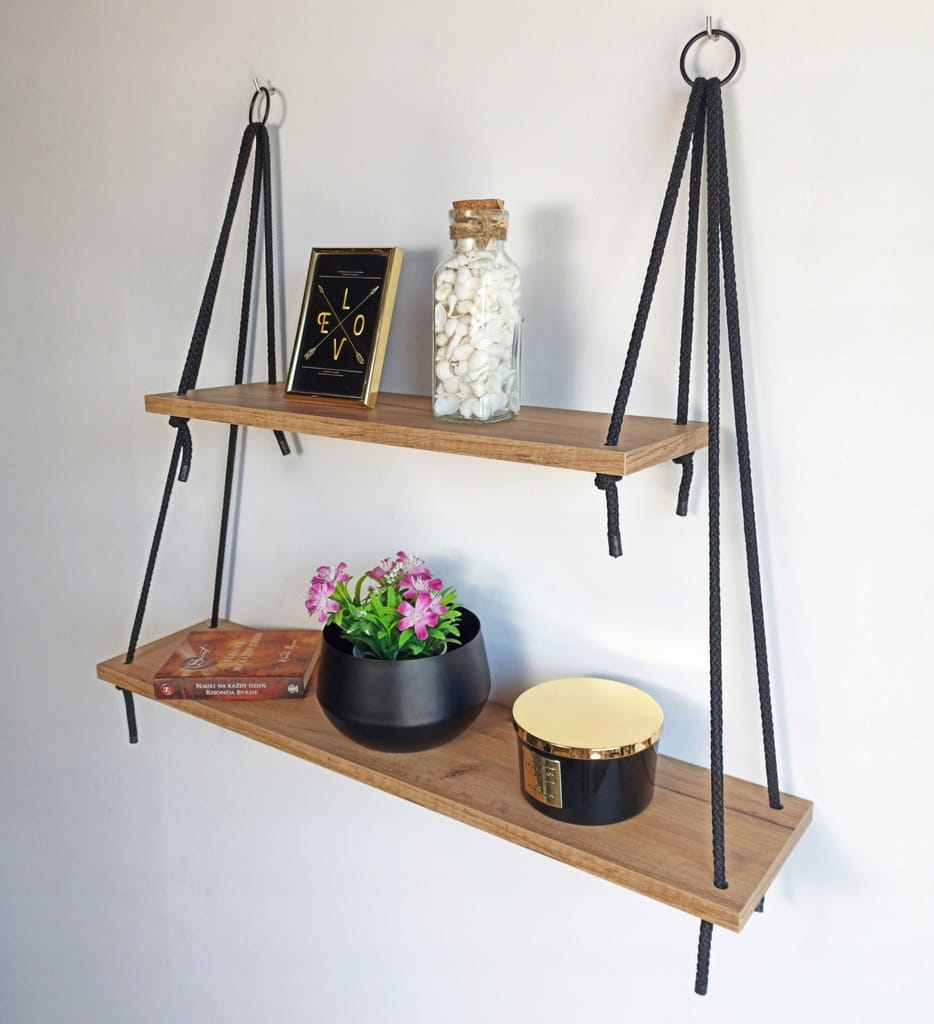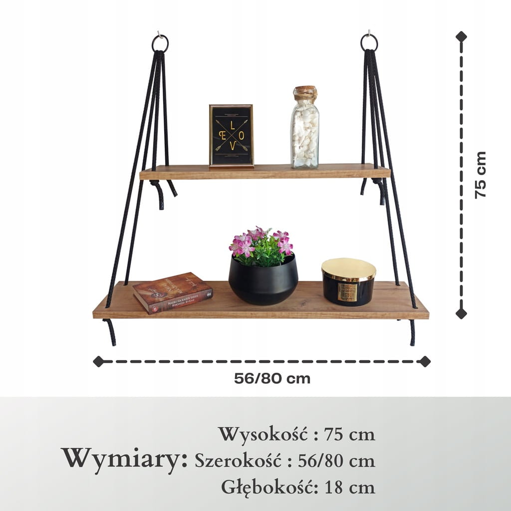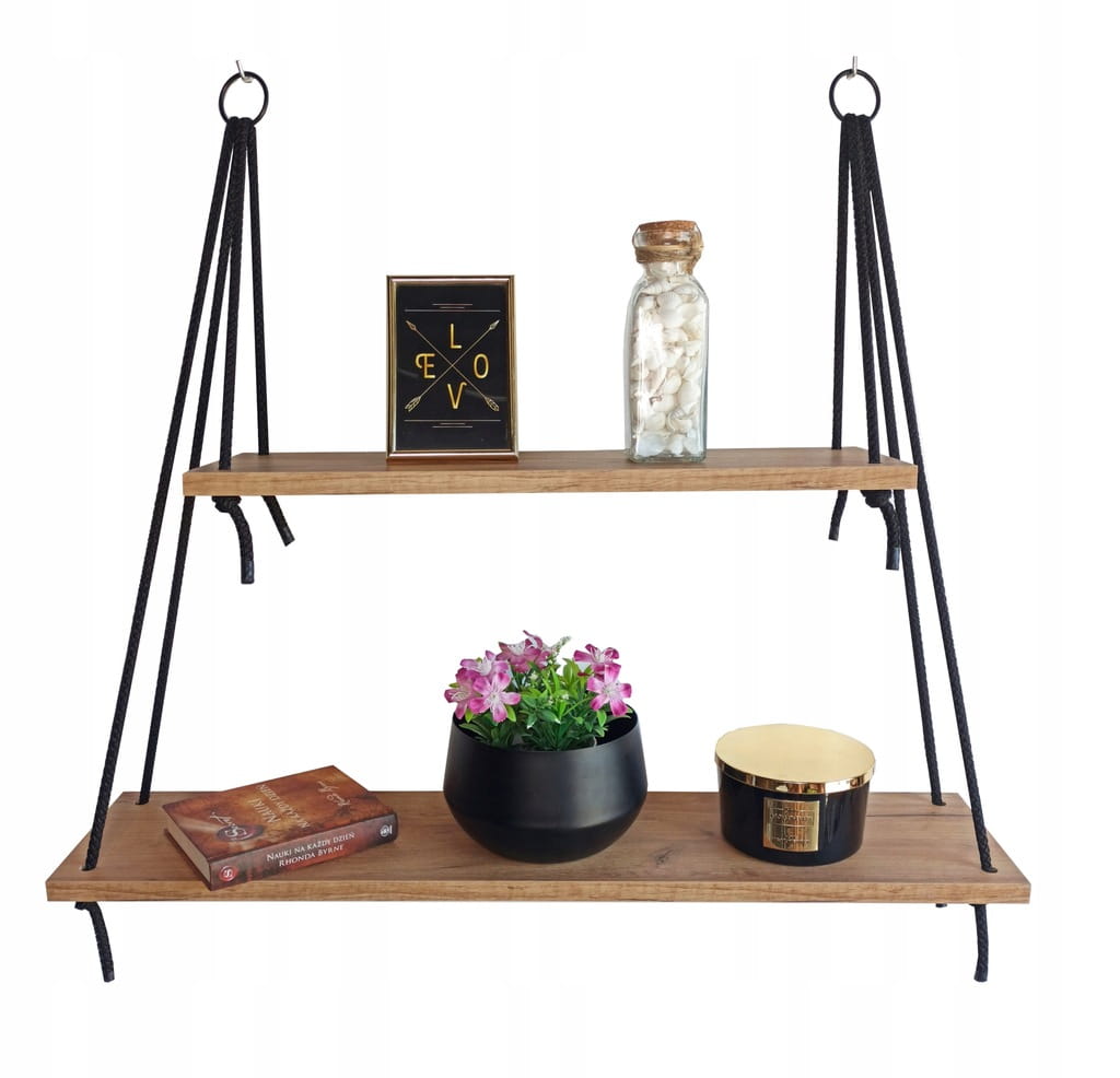 Zestaw zawiera: Półkę 2 poziomową przełożoną sznurem i wyregulowaną (gotową do zawieszenia) + 2 haczyki do montażu