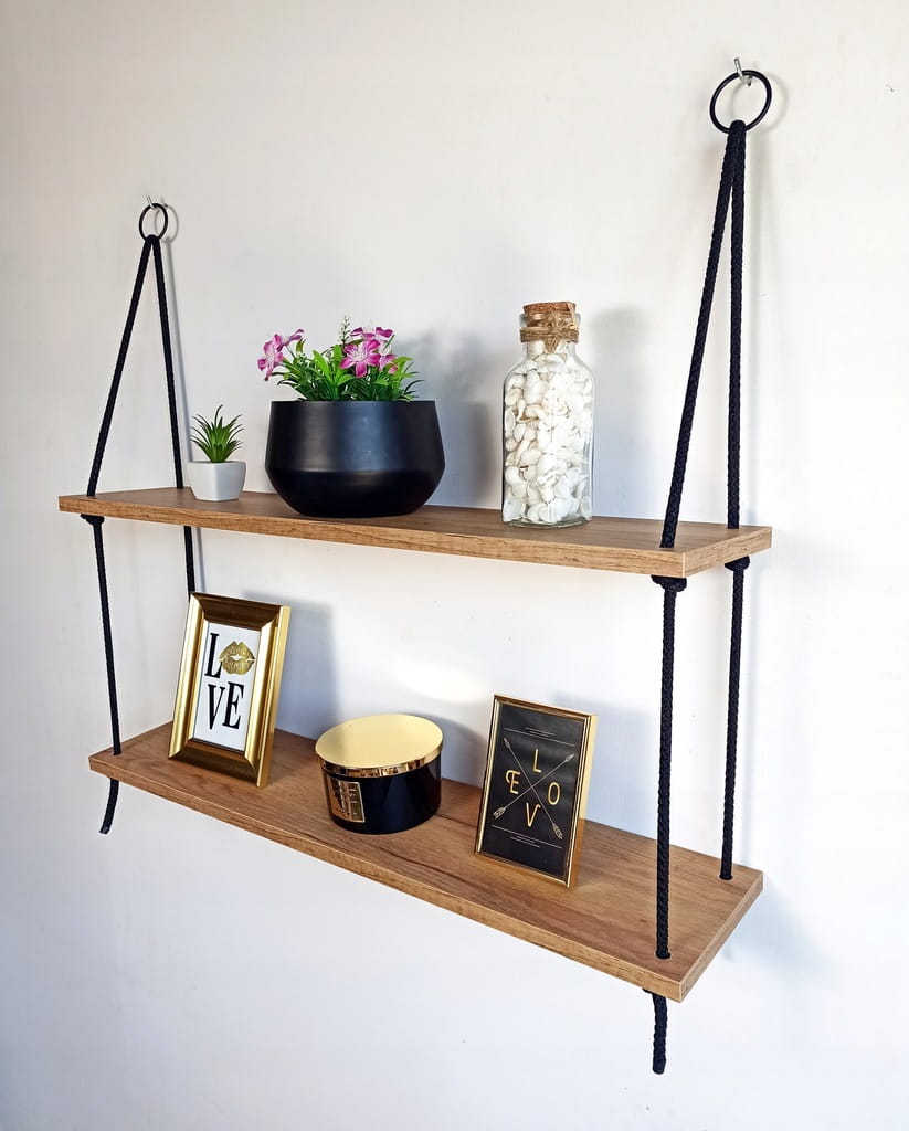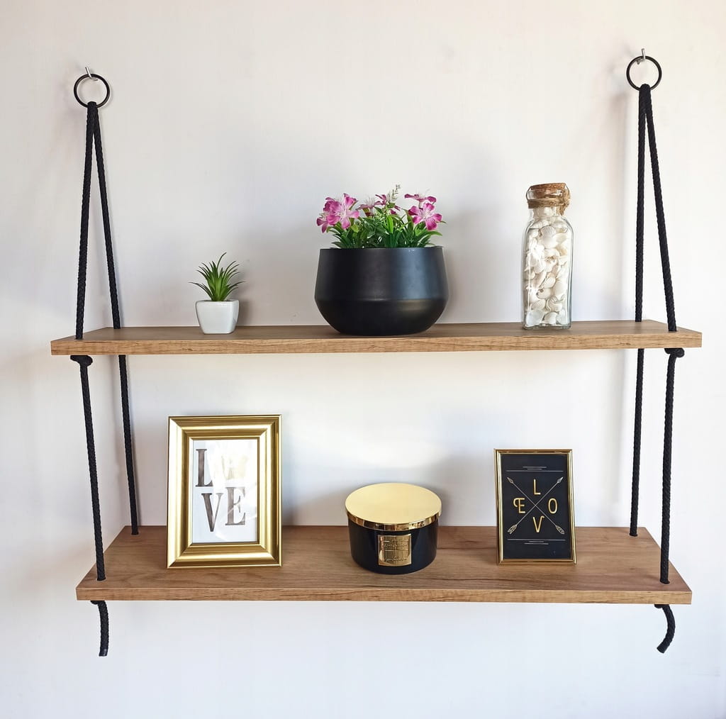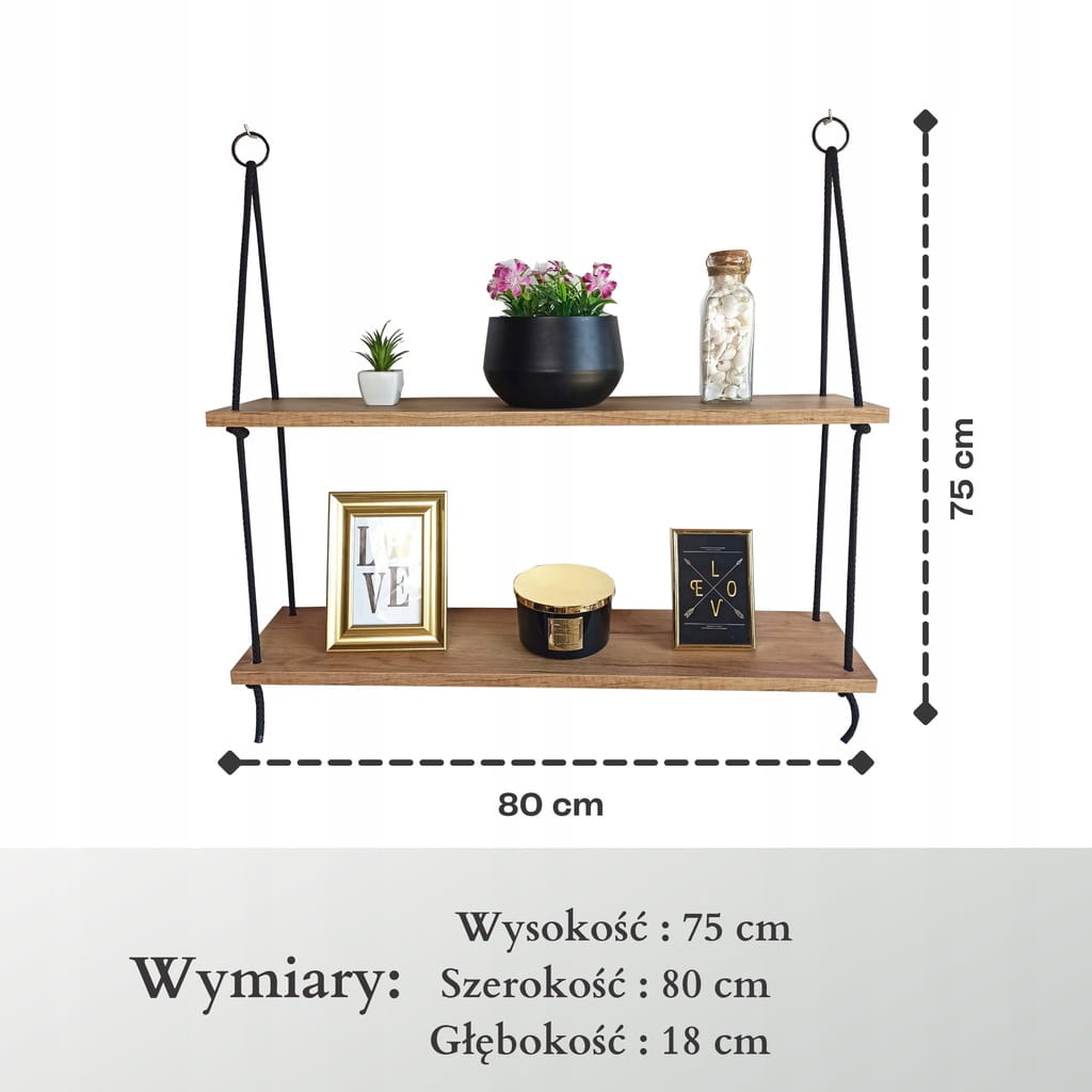 Zestaw zawiera: półkę 2 poziomową (80cm szerokości) przełożoną sznurem i wyregulowaną (gotową do zawieszenia) + 2 haczyki do montażu