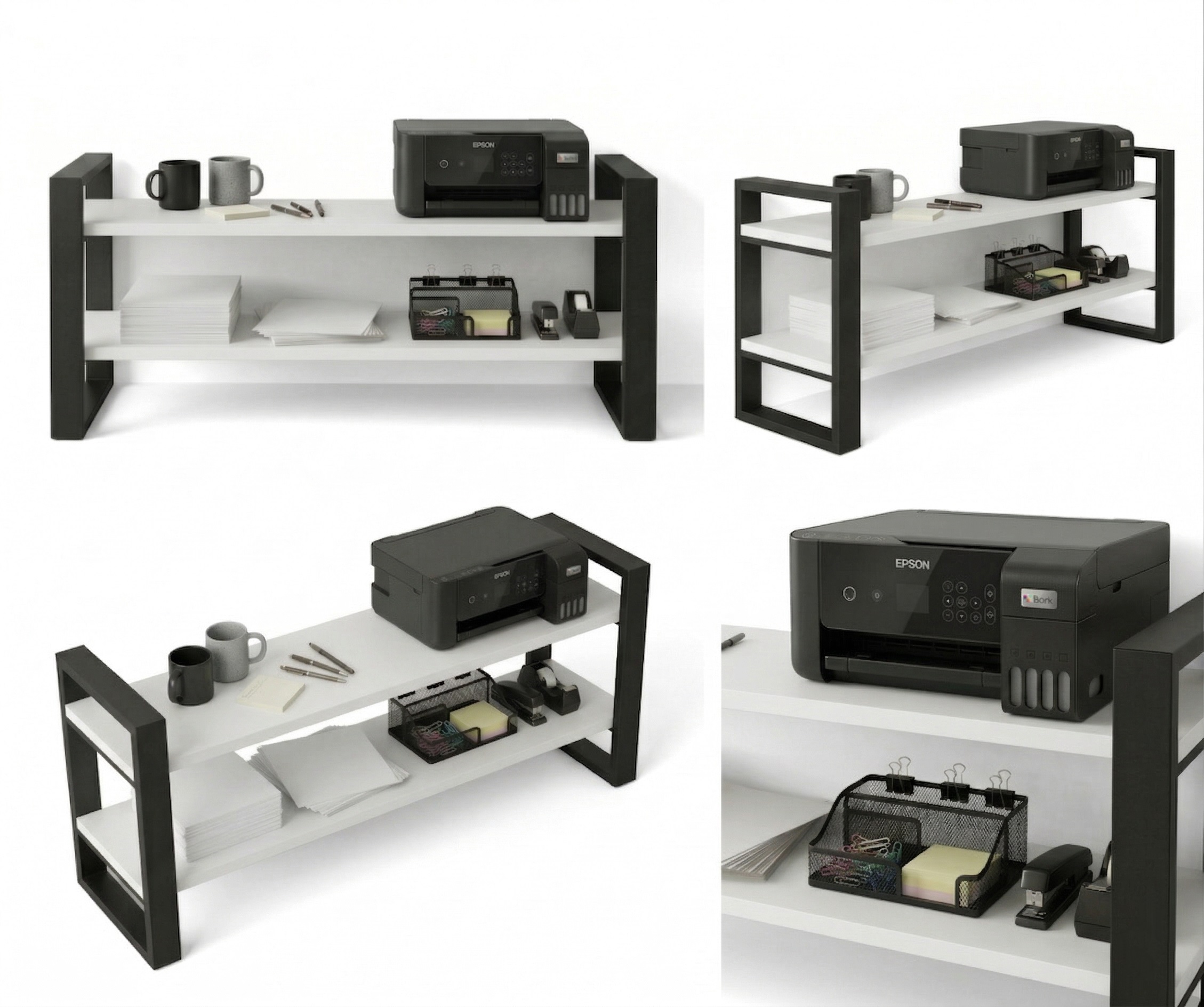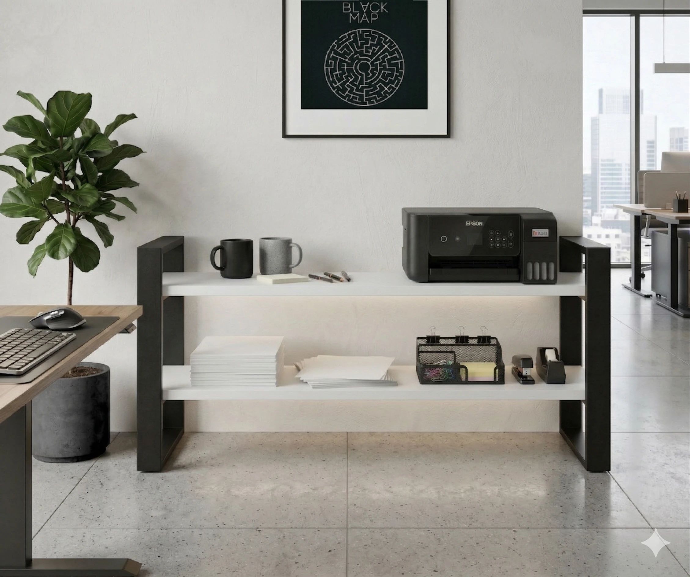 Konstrukcja regału opiera się na solidnym stelażu z profili stalowych malowanych proszkowo na kolor czarny mat, co gwarantuje trwałość i stabilność.