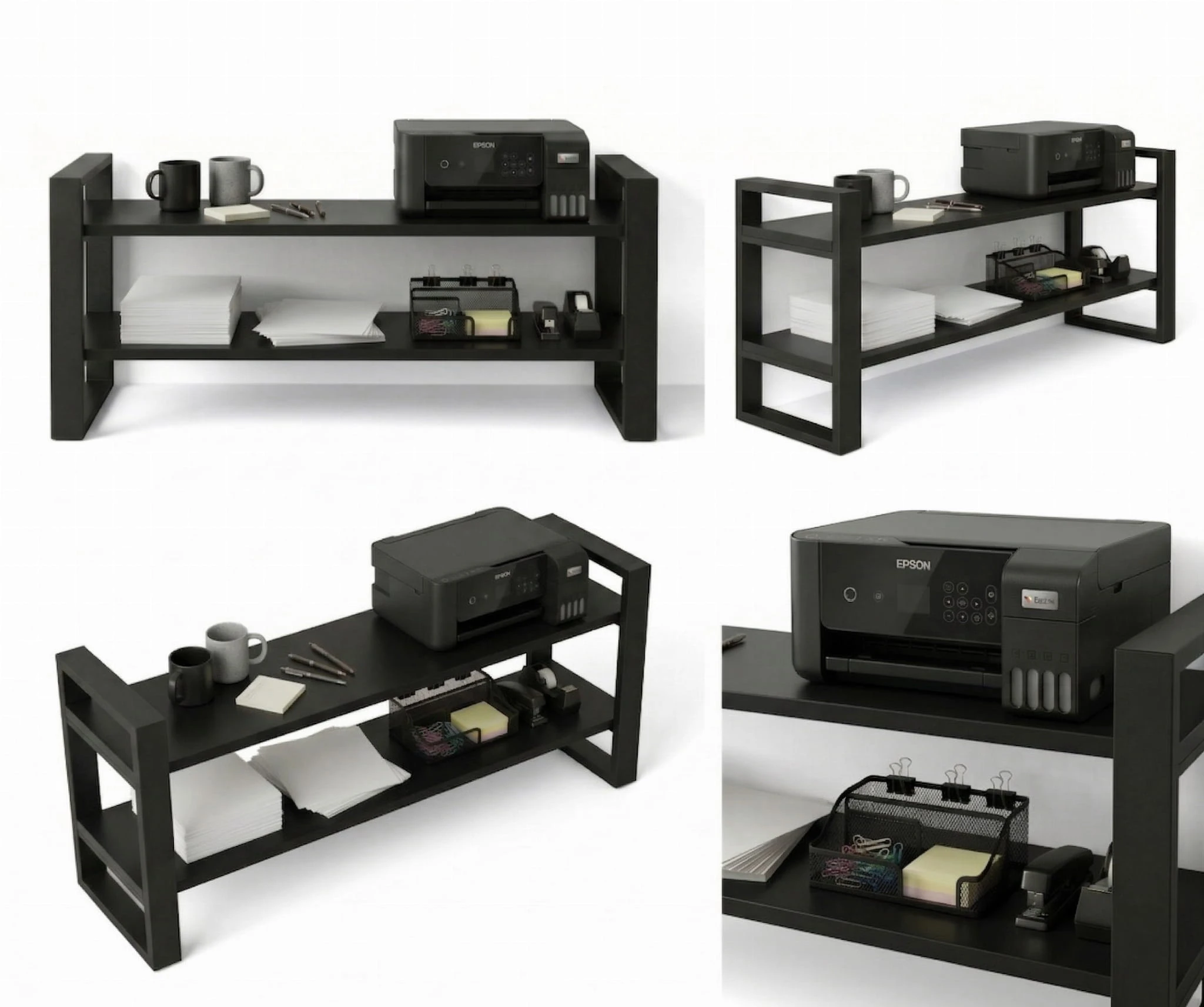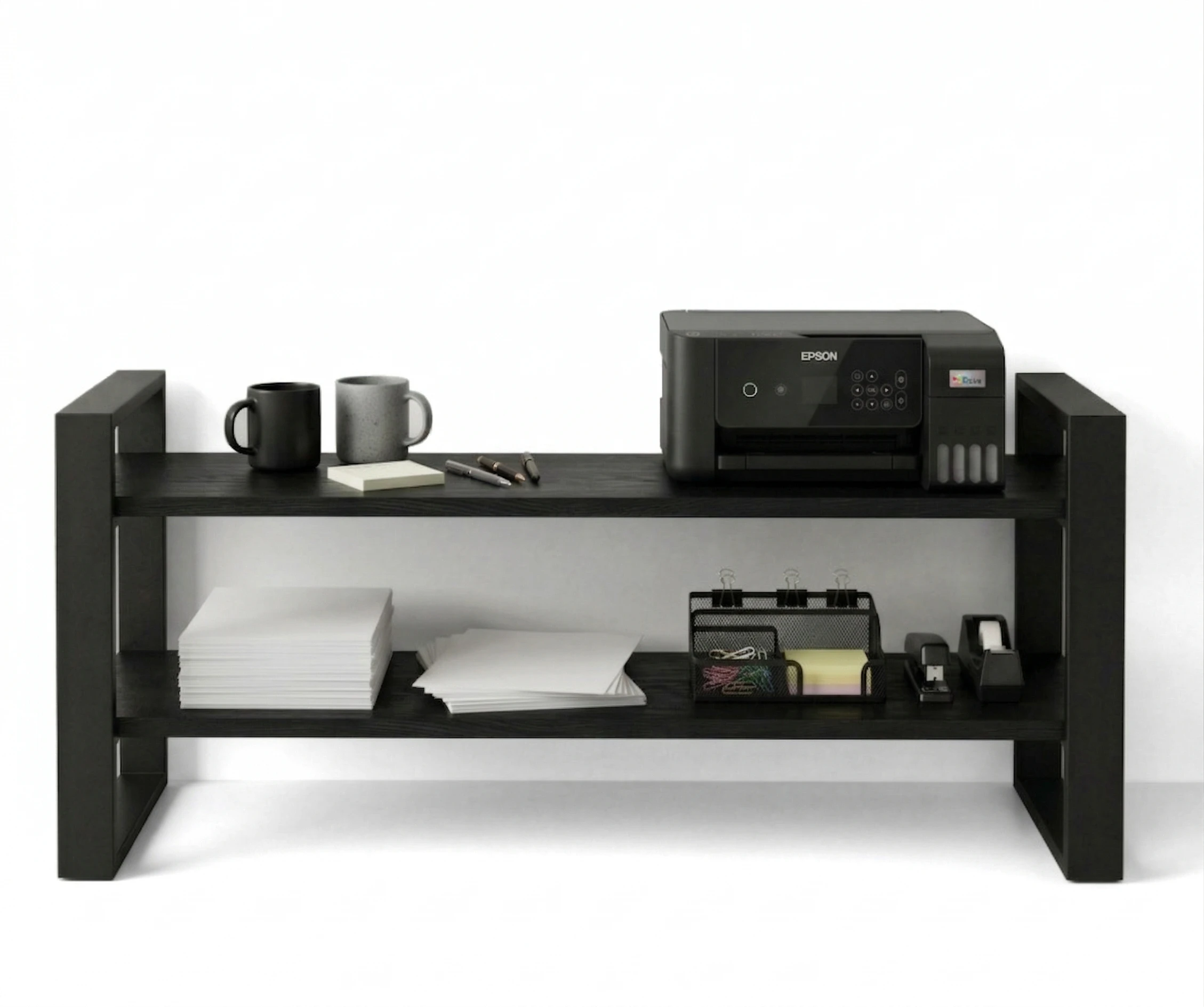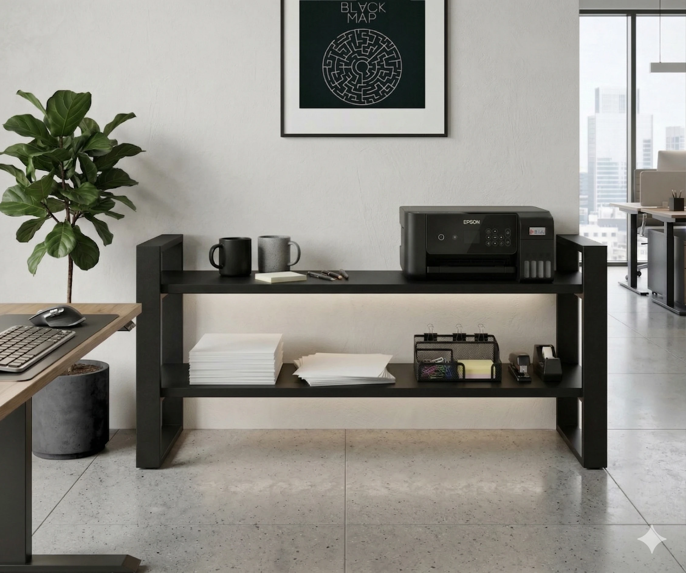 Konstrukcja regału opiera się na solidnym stelażu z profili stalowych malowanych proszkowo na kolor czarny mat, co gwarantuje trwałość i stabilność.