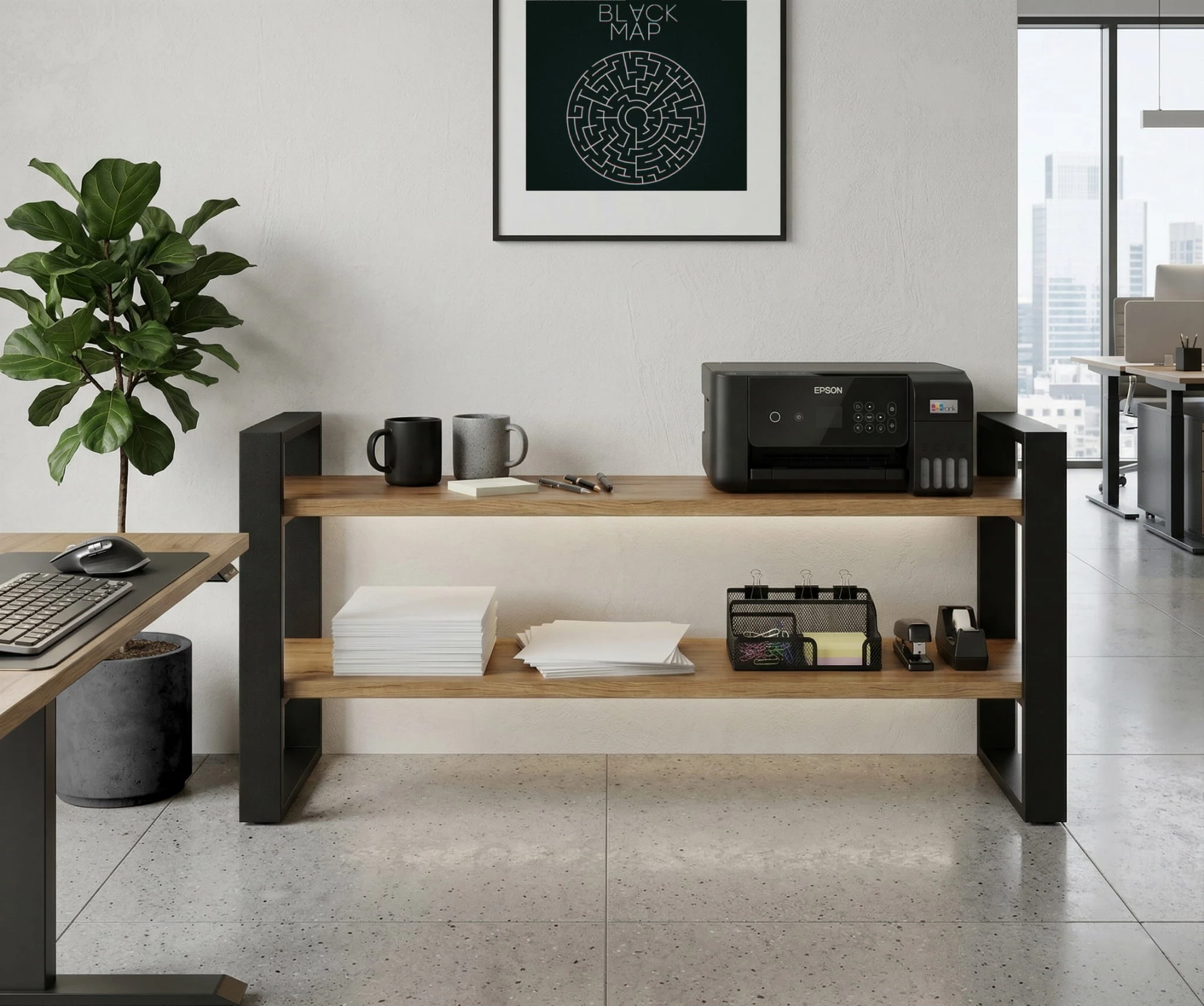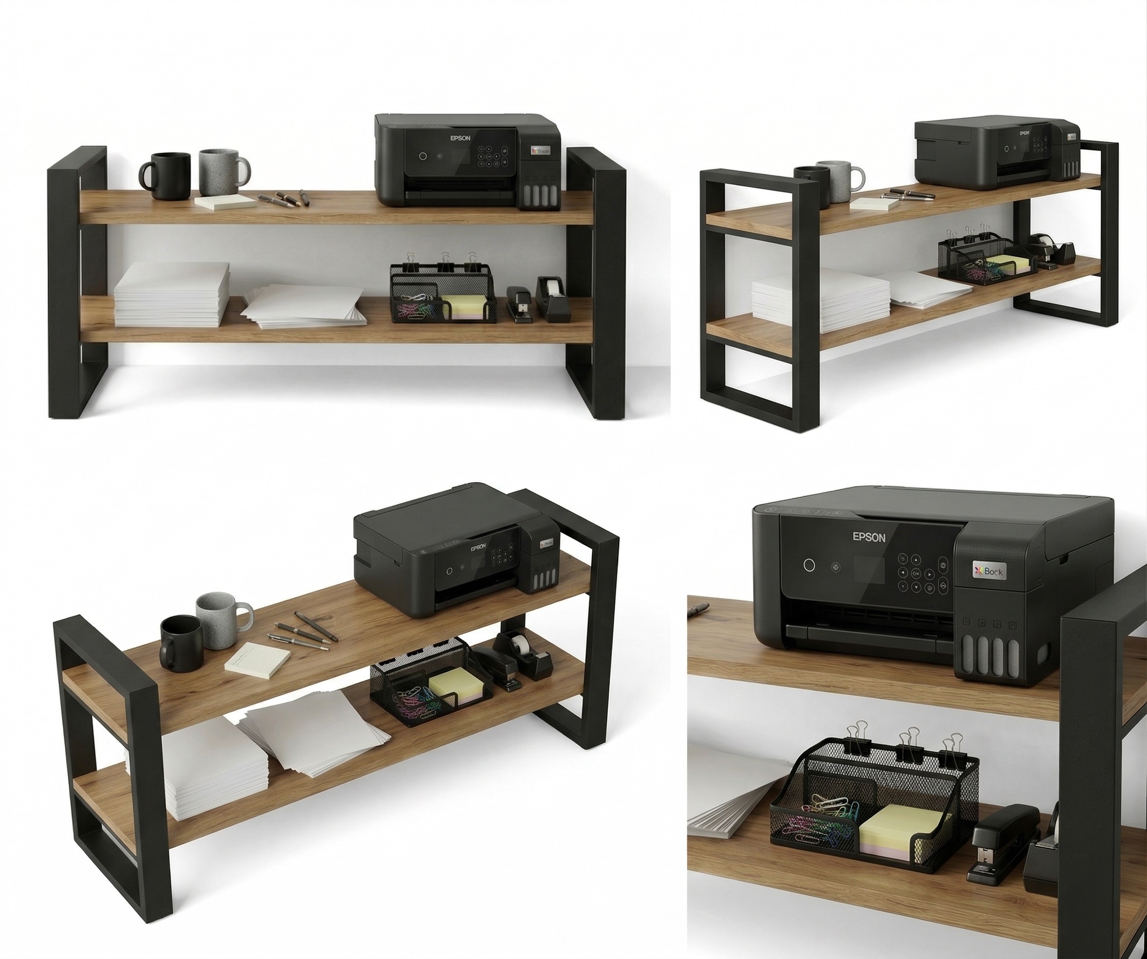 Konstrukcja regału opiera się na solidnym stelażu z profili stalowych malowanych proszkowo na kolor czarny mat, co gwarantuje trwałość i stabilność.