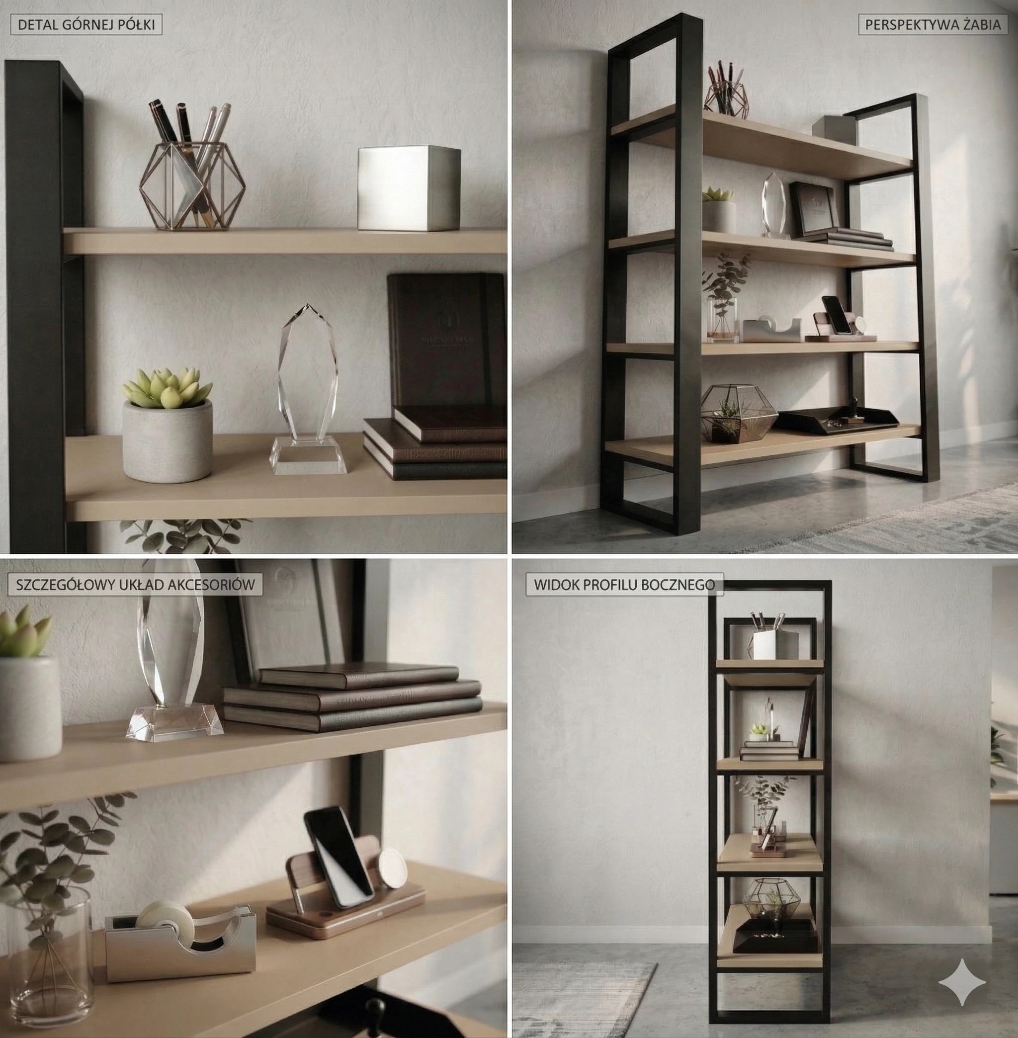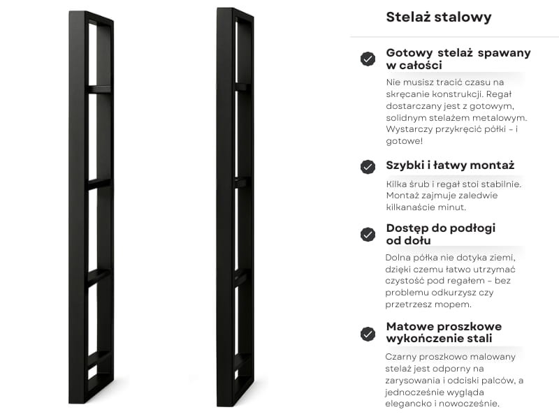 Konstrukcja regału opiera się na solidnym stelażu z profili stalowych malowanych proszkowo na kolor czarny mat, co gwarantuje trwałość i stabilność.