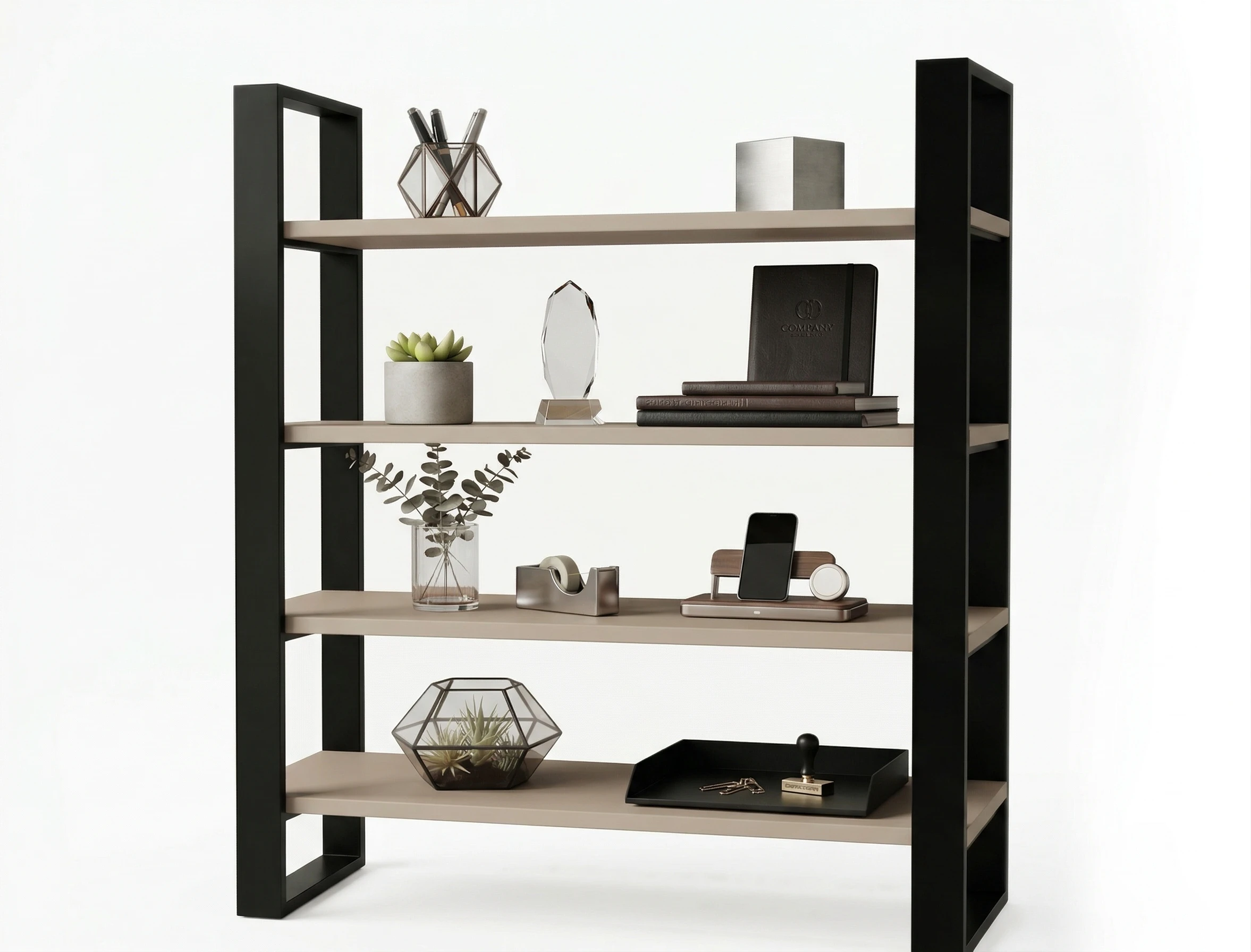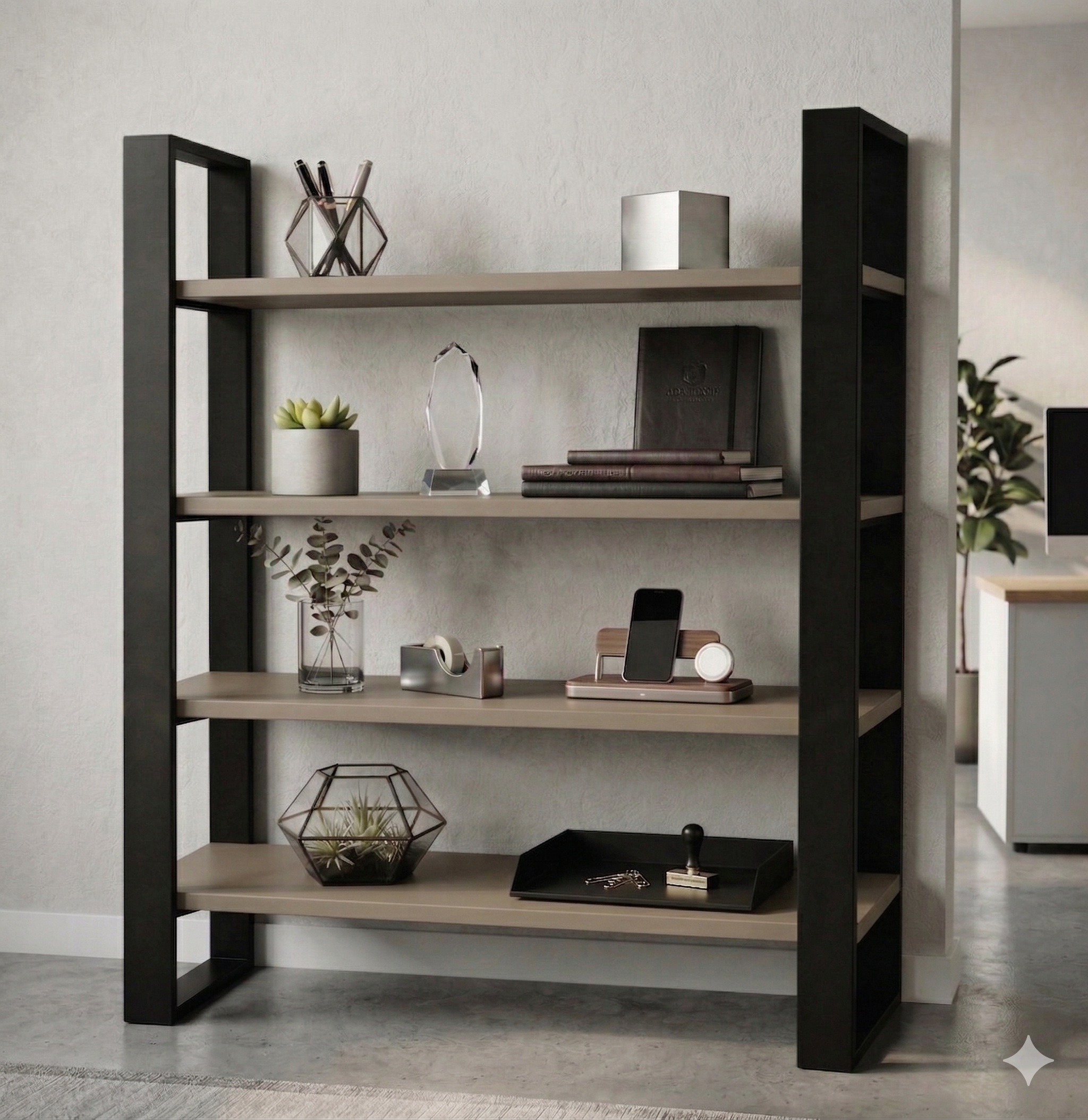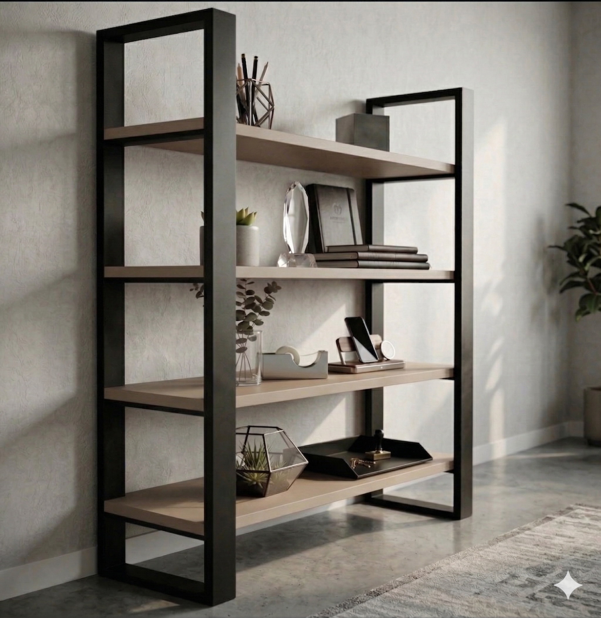 Półki wykonane są z wysokiej jakości płyty laminowanej w dekorze KASZMIROWYM – ciepłym, naturalnym odcieniu, który doskonale komponuje się z surową stalą.