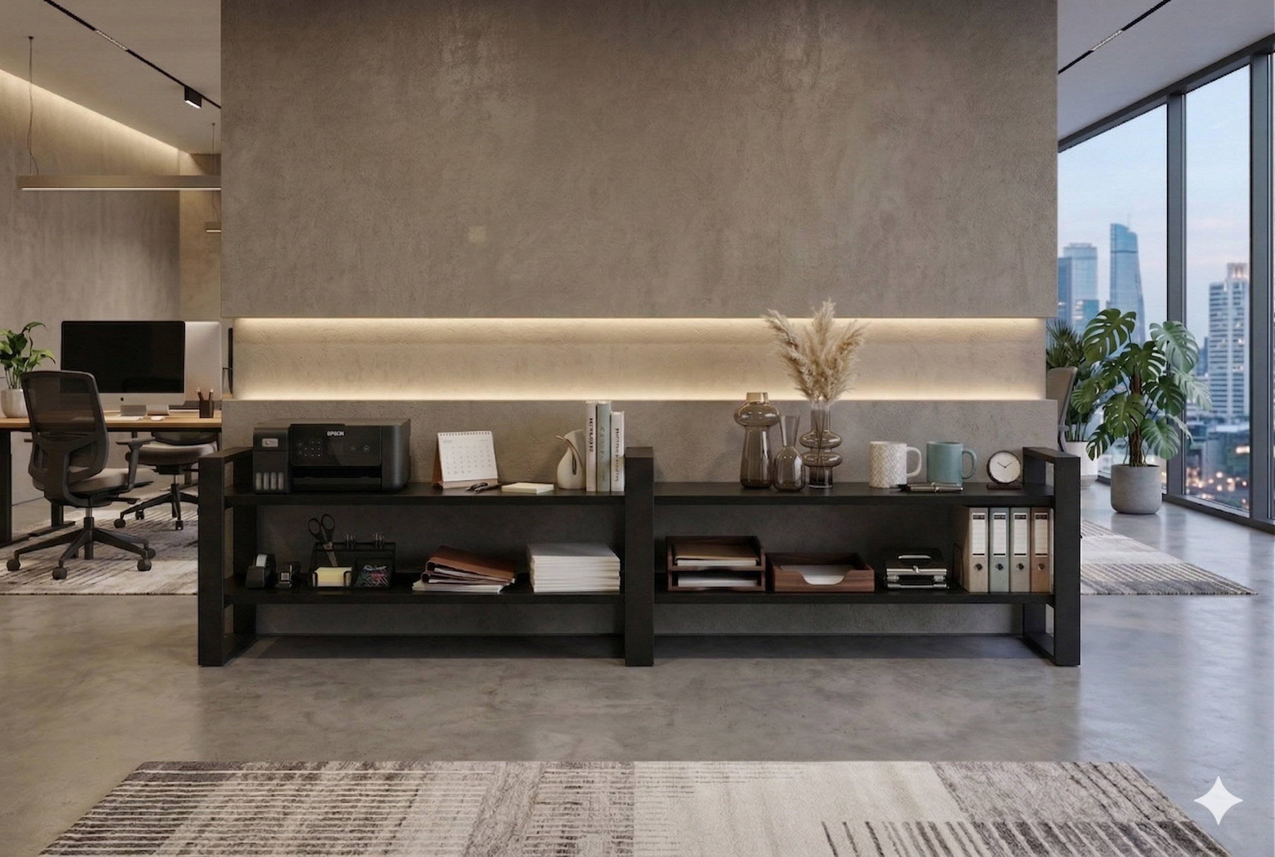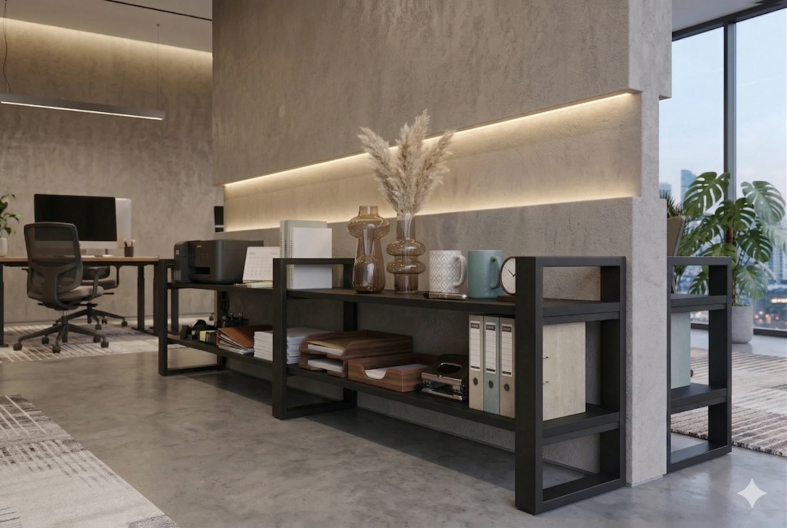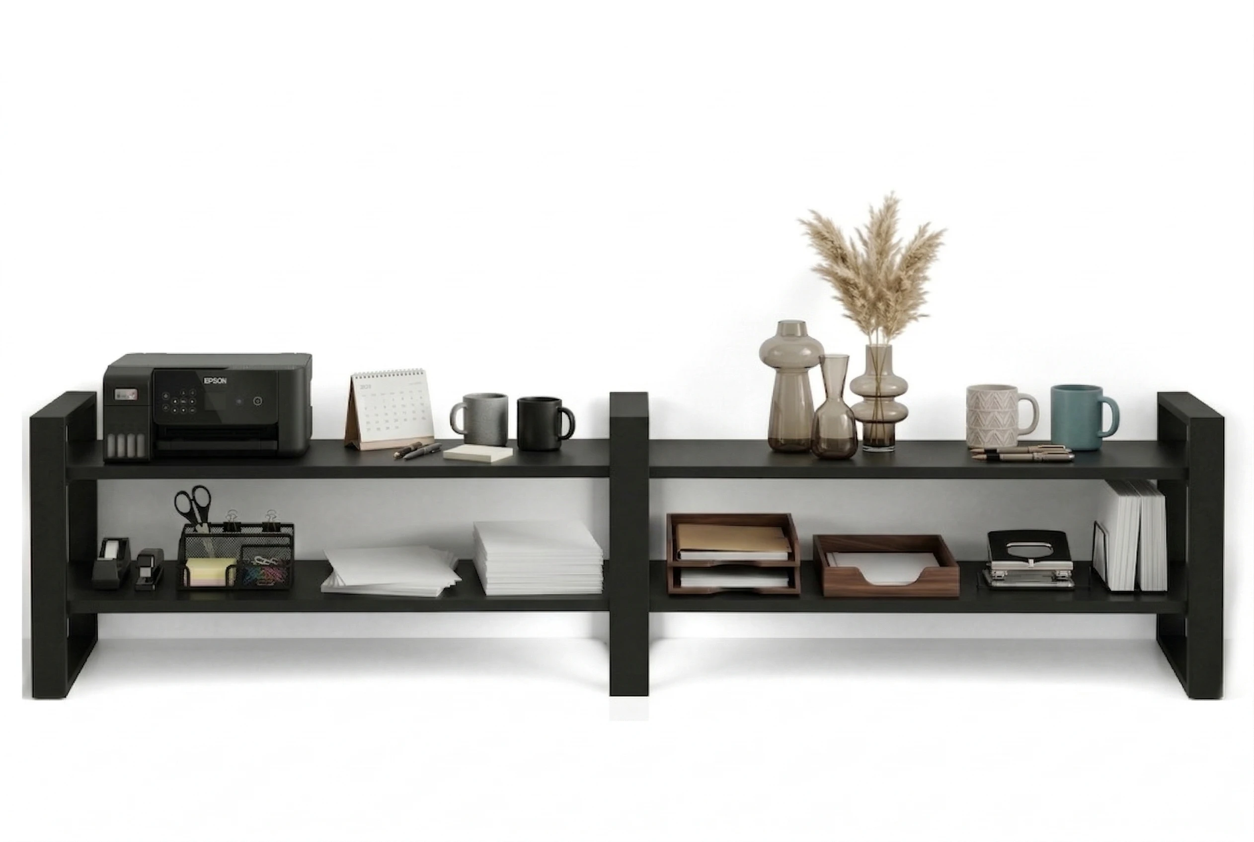 Nowoczesny regał loftowy o wysokości 87 cm to idealne połączenie stylu industrialnego z funkcjonalnością. Szerokość 240 cm i dwie przestronne półki o głębokości 38 cm zapewniają mnóstwo miejsca na książki, dekoracje, rośliny czy akcesoria biurowe.