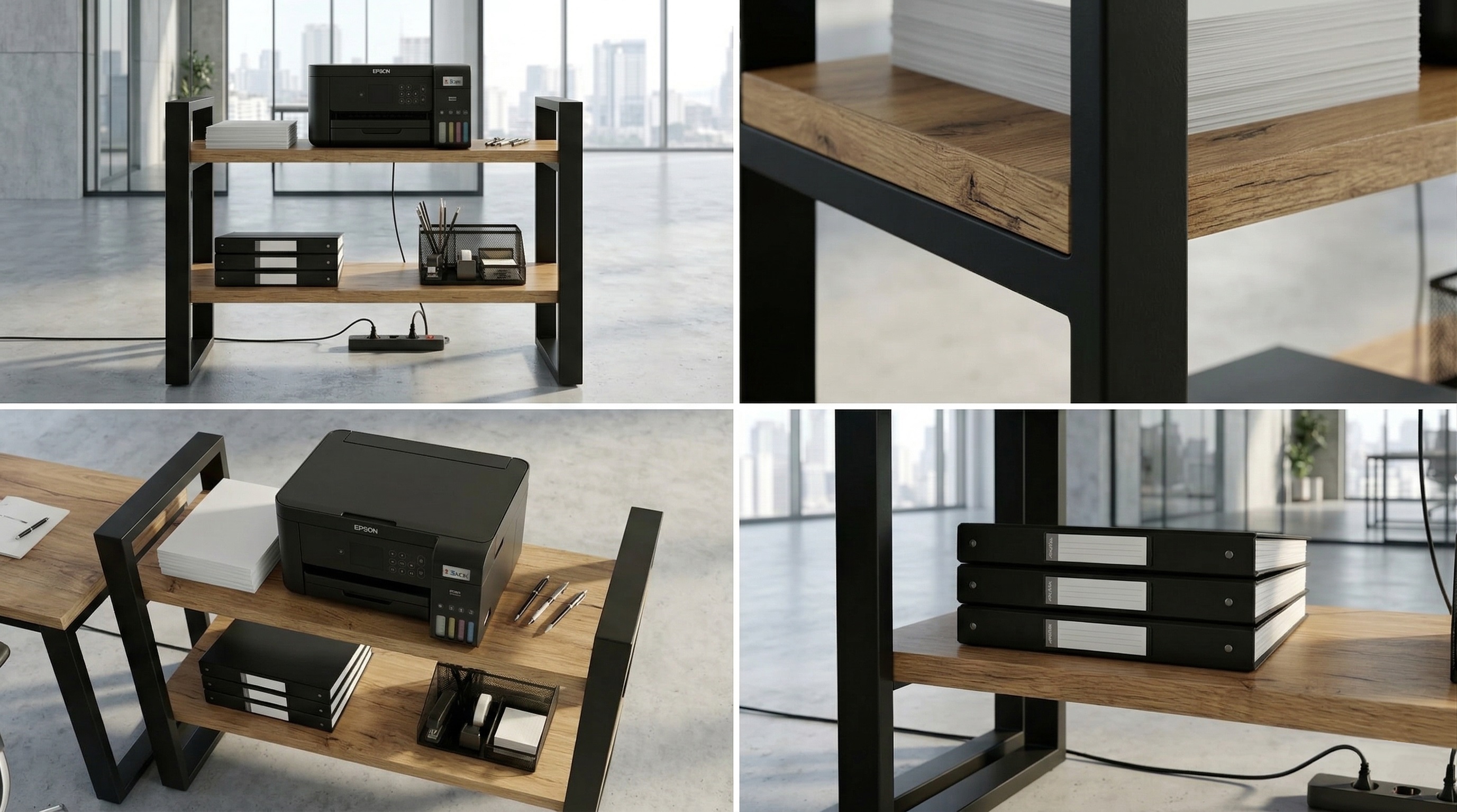 Konstrukcja regału opiera się na solidnym stelażu z profili stalowych malowanych proszkowo na kolor czarny mat, co gwarantuje trwałość i stabilność.