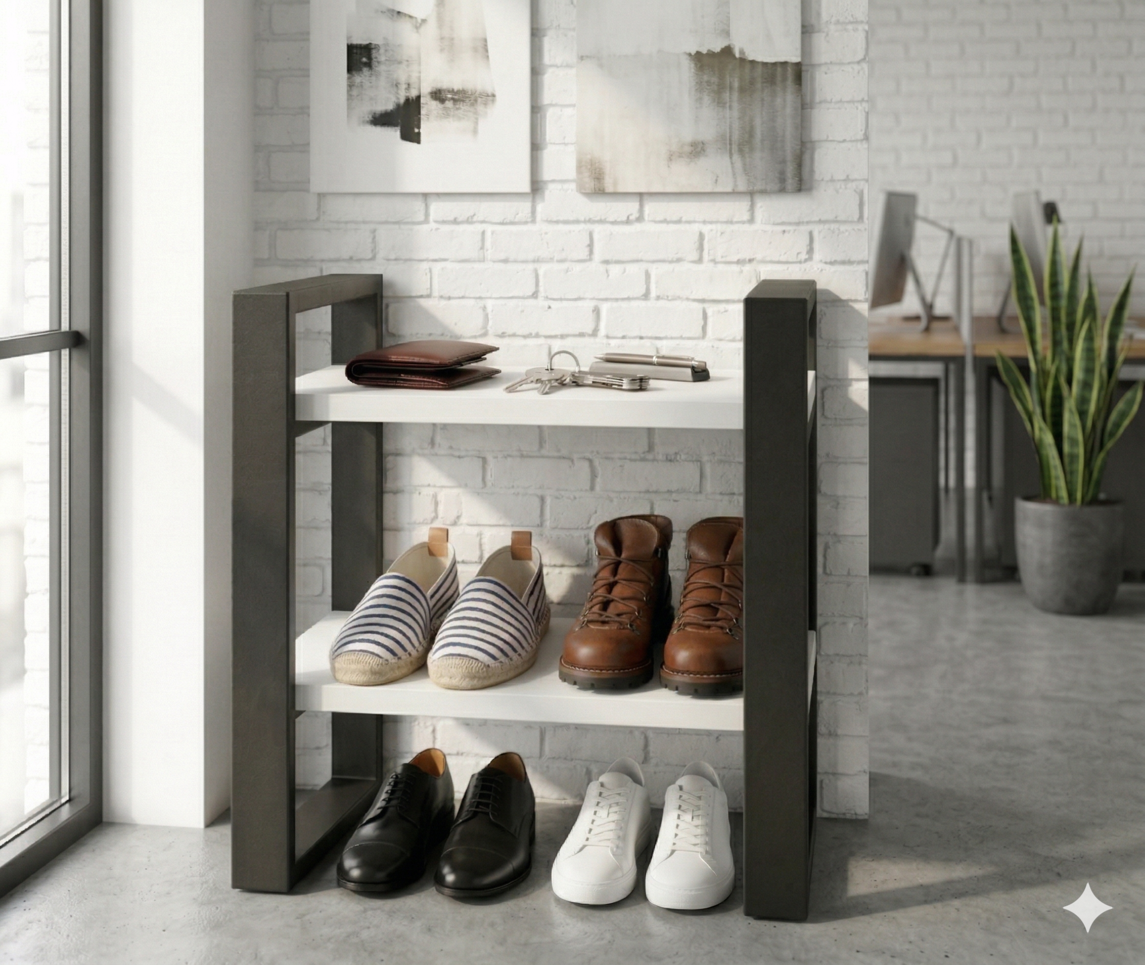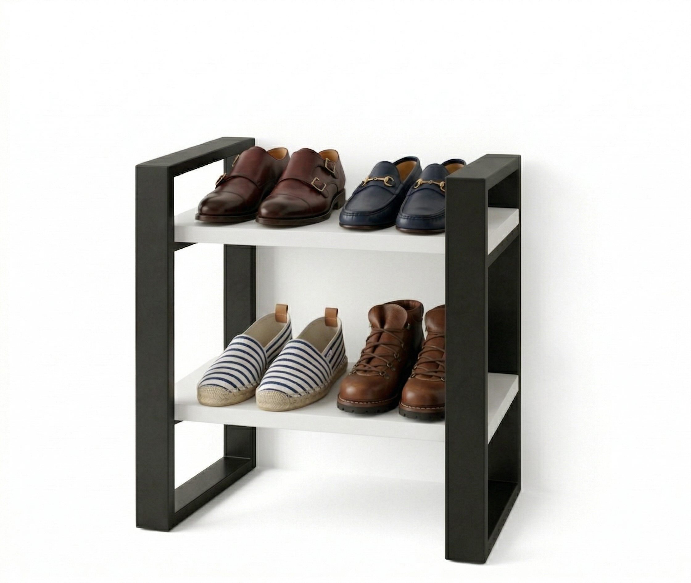 Nowoczesny regał na buty loftowy o wysokości 87 cm to idealne połączenie stylu industrialnego z funkcjonalnością. Szerokość 60 cm i dwie przestronne półki o głębokości 38 cm zapewniają mnóstwo miejsca na buty.