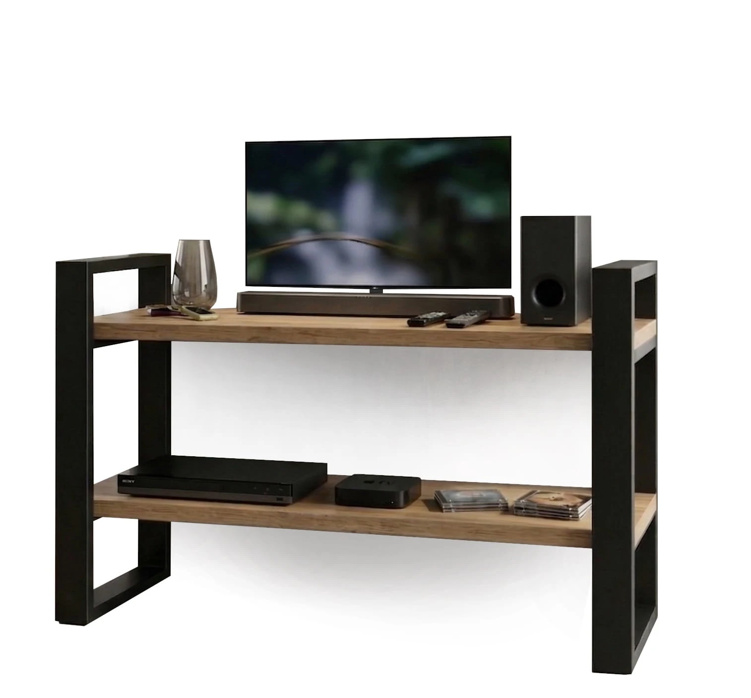 Nowoczesny regał loftowy RTV o wysokości 87cm to idealne połączenie stylu industrialnego z funkcjonalnością. Szerokość 120 cm i dwie przestronne półki o głębokości 38 cm zapewniają mnóstwo miejsca na buty.