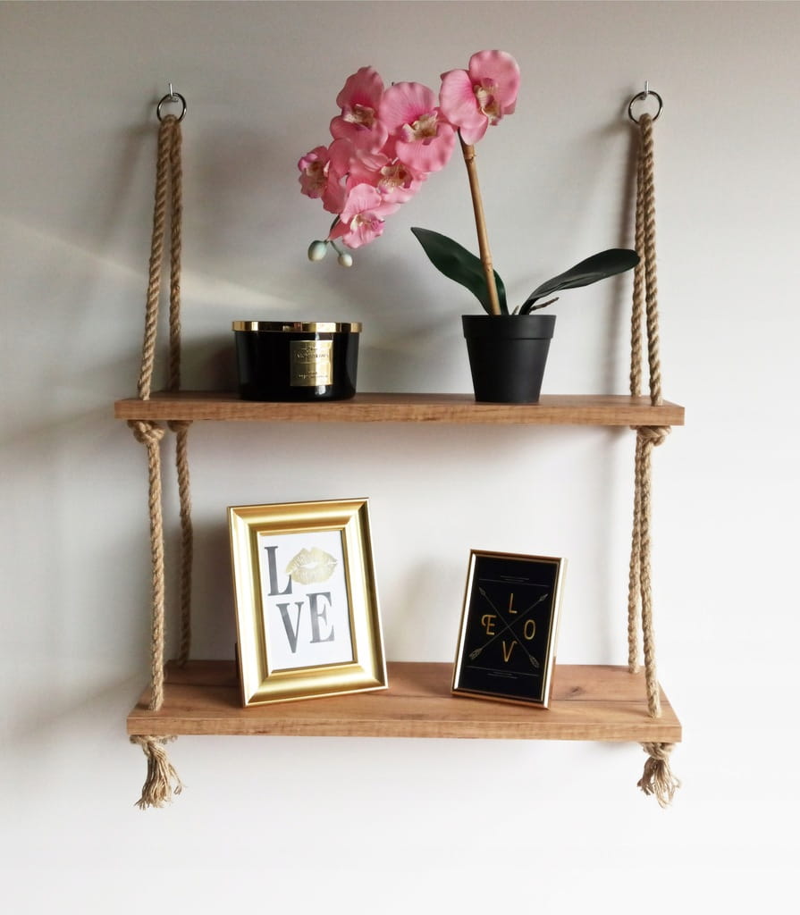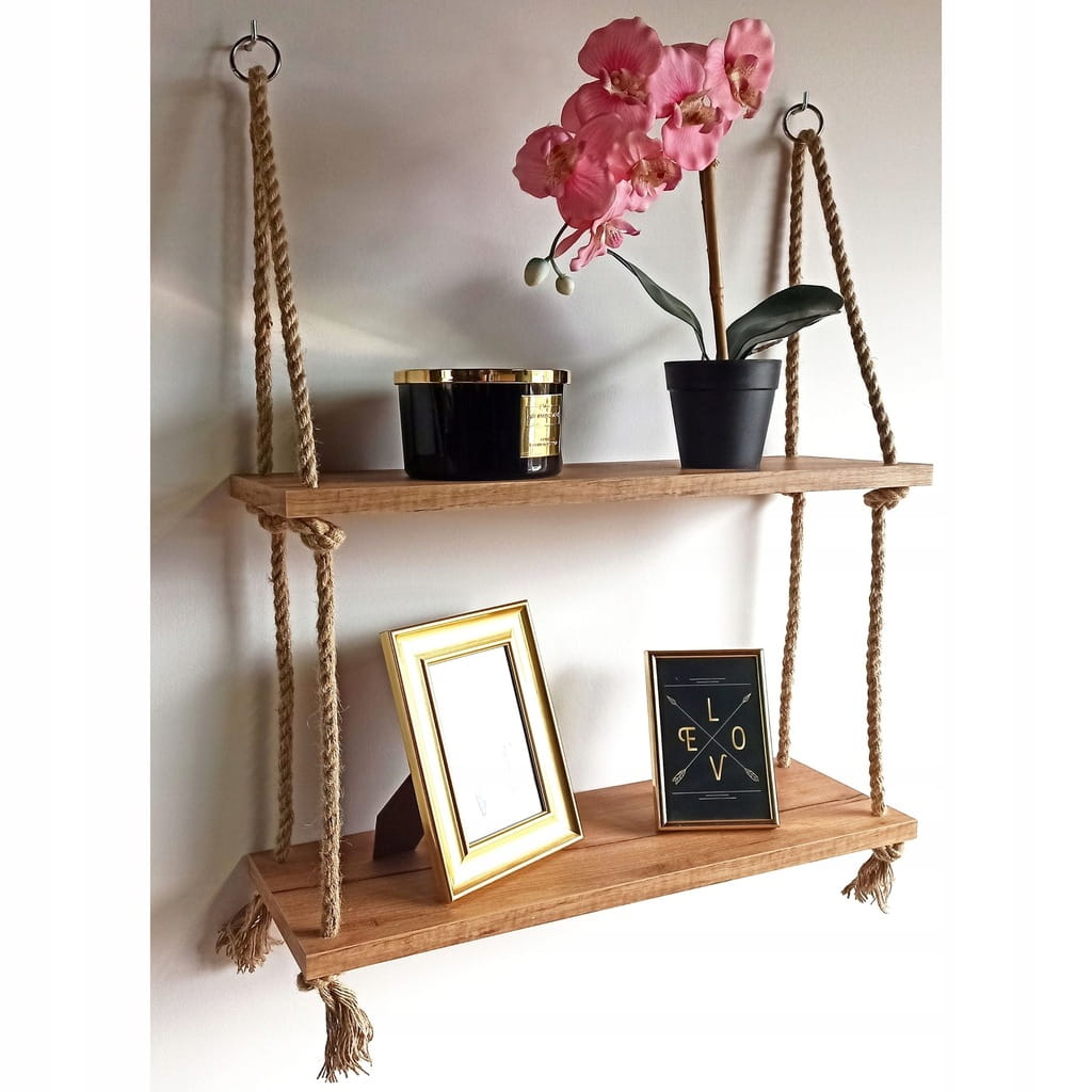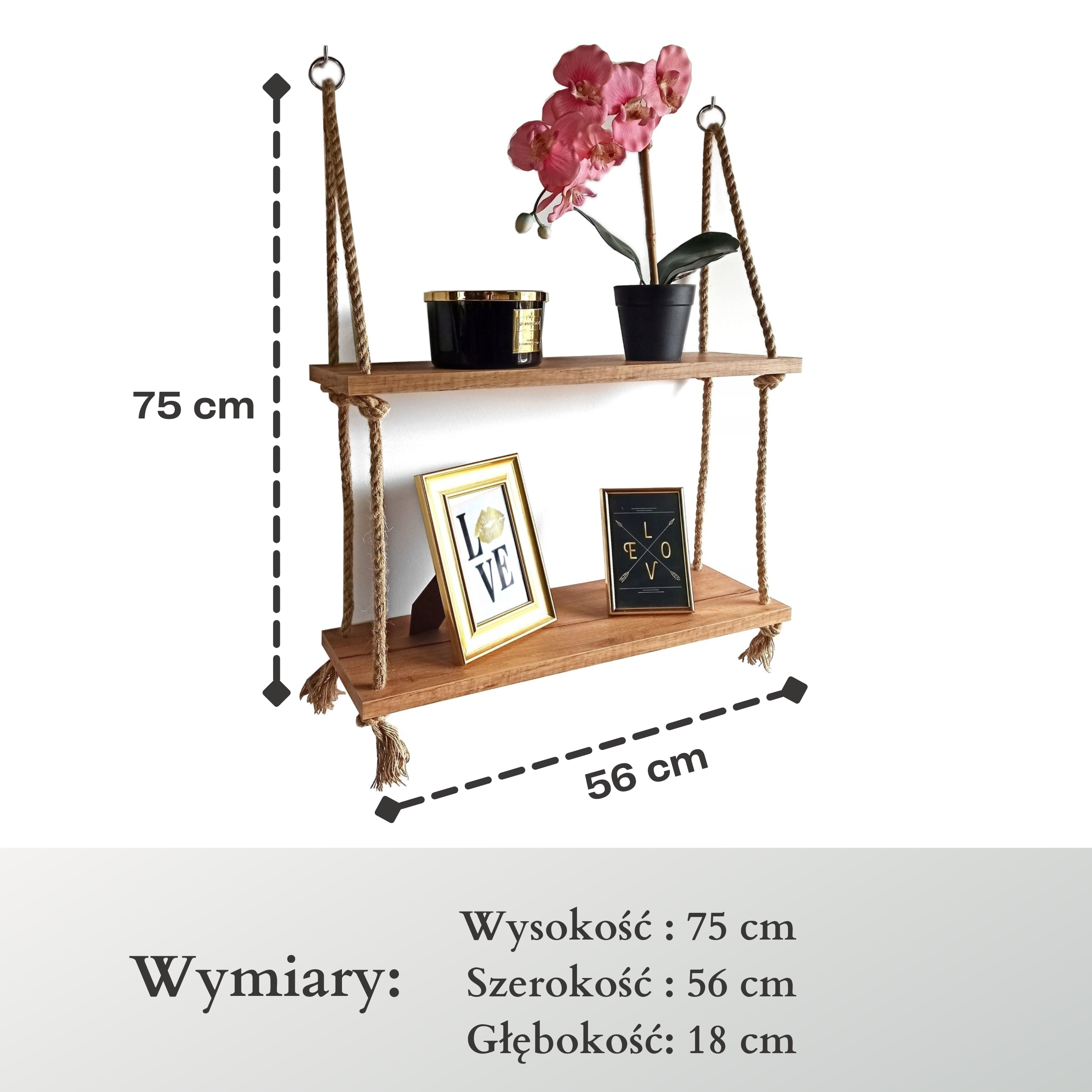 Zestaw zawiera: półkę 2 poziomową przełożoną sznurem i wyregulowaną (gotową do zawieszenia) + 2 haczyki do montażu